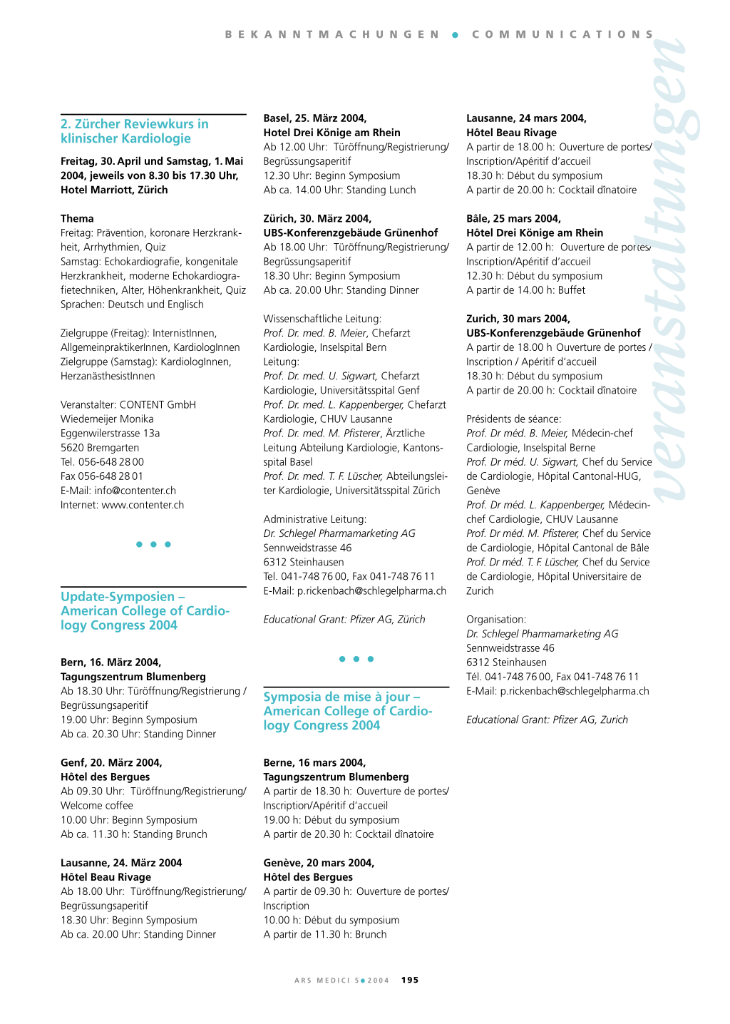 2. Zürcher Reviewkurs in klinischer KardiologieUpdate-Symposien – American College of Cardiology Congress 2004