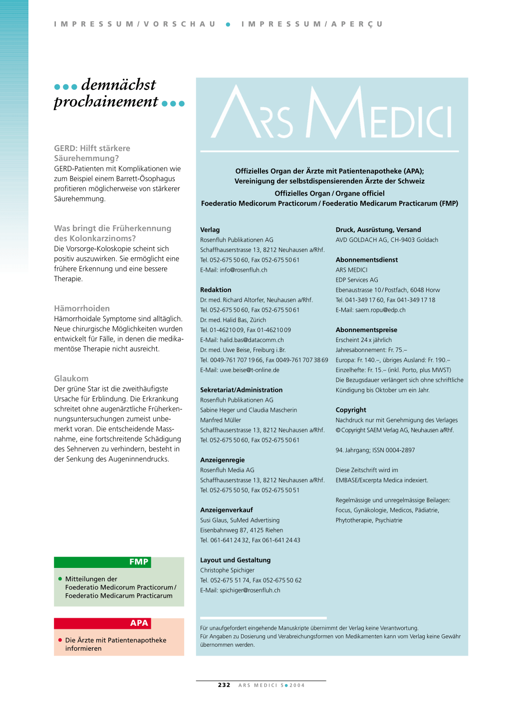 Offizielles Organ der Ärzte mit Patientenapotheke (APA); Vereinigung der selbstdispensierenden Ärzte der Schweiz
