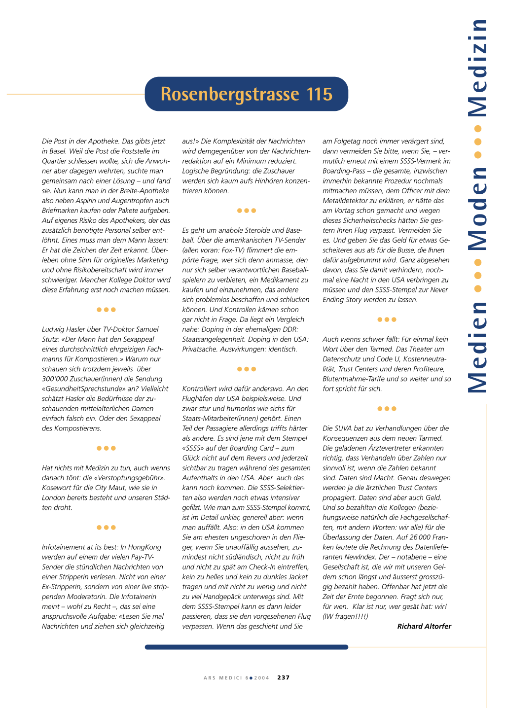 Ludwig Hasler über TV-Doktor Samuel Stutz: «Der Mann hat den Sexappeal eines durchschnittlich ehrgeizigen Fachmanns für Kompostieren.» Warum nur schauen sich trotzdem jeweils über 300'000 Zuschauer(innen) die Sendung «GesundheitSprechstunde» an? Vielleicht schätzt Hasler die Bedürfnisse der zuschauenden mittelalterlichen Damen einfach falsch ein. Oder den Sexappeal des Kompostierens.