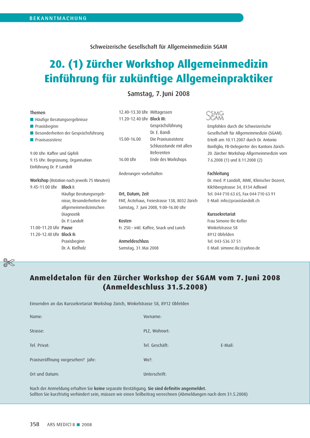 Anmeldetalon für den Zürcher Workshop der SGAM vom 7. Juni 2008 (Anmeldeschluss 31.5.2008)