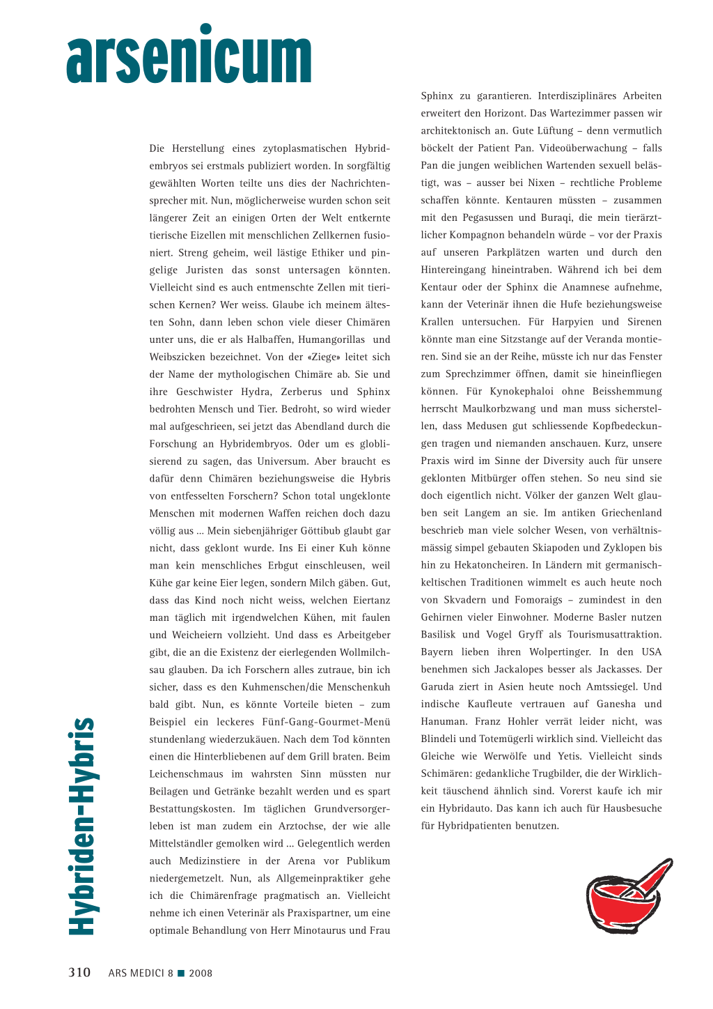 Die Herstellung eines zytoplasmatischen Hybridembryos sei erstmals publiziert worden. In sorgfältig gewählten Worten teilte uns dies der Nachrichtensprecher mit. Nun, möglicherweise wurden schon seit längerer Zeit an einigen Orten der Welt entkernte tierische Eizellen mit menschlichen Zellkernen fusioniert. Streng geheim, weil lästige Ethiker und pingelige Juristen das sonst untersagen könnten. Vielleicht sind es auch entmenschte Zellen mit tierischen Kernen? Wer weiss. Glaube ich meinem ältesten Sohn, dann leben schon viele dieser Chimären unter uns, die er als Halbaffen, Humangorillas und Weibszicken bezeichnet. Von der «Ziege» leitet sich der Name der mythologischen Chimäre ab. Sie und ihre Geschwister Hydra, Zerberus und Sphinx bedrohten Mensch und Tier. Bedroht, so wird wieder mal aufgeschrieen, sei jetzt das Abendland durch die Forschung an Hybridembryos. Oder um es globlisierend zu sagen, das Universum. Aber braucht es dafür denn Chimären beziehungsweise die Hybris von entfesselten Forschern? Schon total ungeklonte Menschen mit modernen Waffen reichen doch dazu völlig aus … Mein siebenjähriger Göttibub glaubt gar nicht, dass geklont wurde. Ins Ei einer Kuh könne man kein menschliches Erbgut einschleusen, weil Kühe gar keine Eier legen, sondern Milch gäben. Gut, dass das Kind noch nicht weiss, welchen Eiertanz man täglich mit irgendwelchen Kühen, mit faulen und Weicheiern vollzieht. Und dass es Arbeitgeber gibt, die an die Existenz der eierlegenden Wollmilchsau glauben. Da ich Forschern alles zutraue, bin ich sicher, dass es den Kuhmenschen/die Menschenkuh bald gibt. Nun, es könnte Vorteile bieten – zum Beispiel ein leckeres Fünf-Gang-Gourmet-Menü stundenlang wiederzukäuen. Nach dem Tod könnten einen die Hinterbliebenen auf dem Grill braten. Beim Leichenschmaus im wahrsten Sinn müssten nur Beilagen und Getränke bezahlt werden und es spart Bestattungskosten. Im täglichen Grundversorgerleben ist man zudem ein Arztochse, der wie alle Mittelständler gemolken wird ... Gelegentlich werden auch Medizinstiere in der Arena vor Publikum niedergemetzelt. Nun, als Allgemeinpraktiker gehe ich die Chimärenfrage pragmatisch an. Vielleicht nehme ich einen Veterinär als Praxispartner, um eine optimale Behandlung von Herr Minotaurus und Frau