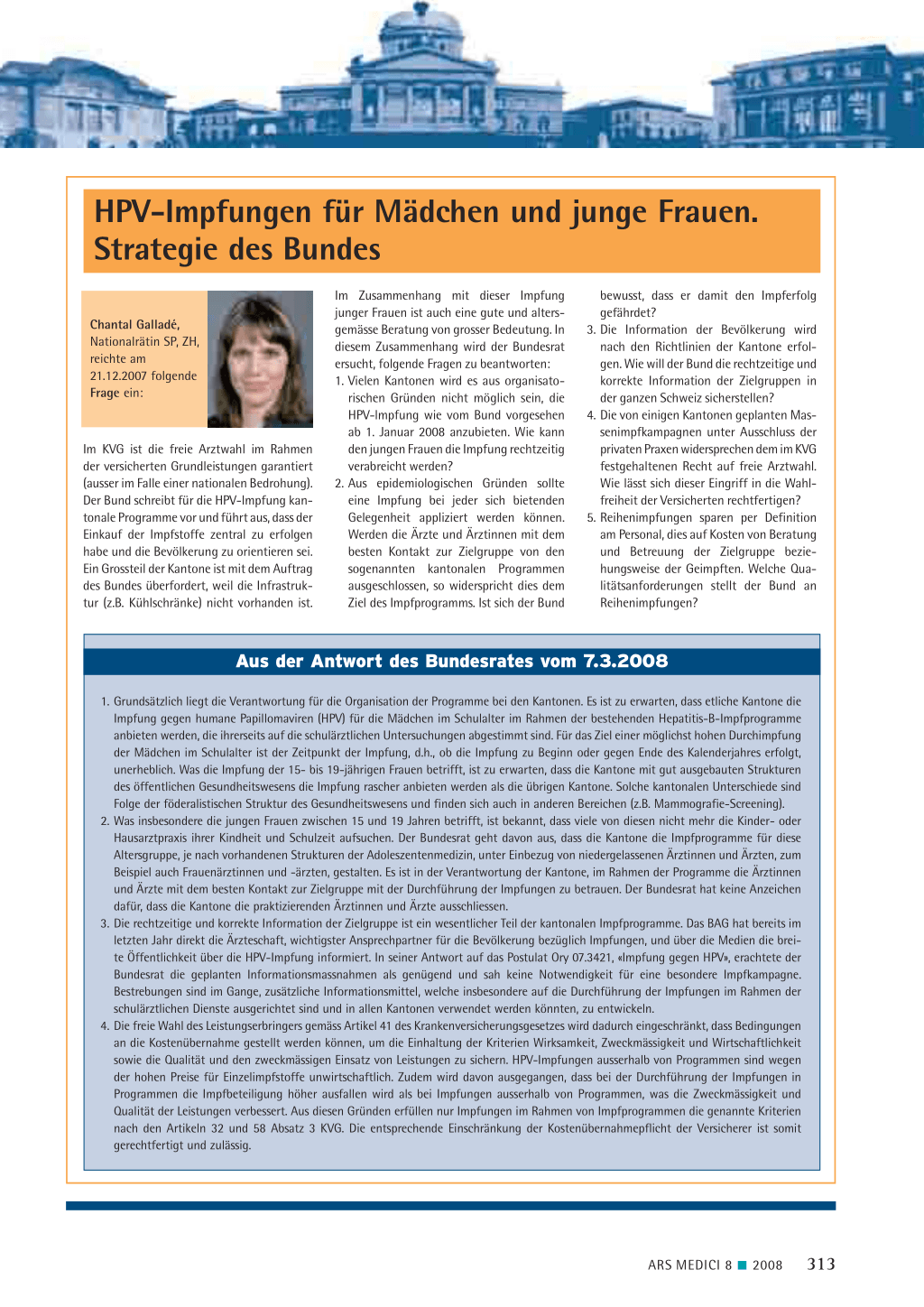 rischen Gründen nicht möglich sein, die HPV-lmpfung wie vom Bund vorgesehen ab 1. Januar 2008 anzubieten. Wie kann den jungen Frauen die Impfung rechtzeitig verabreicht werden? 2. Aus epidemiologischen Gründen sollte eine Impfung bei jeder sich bietenden Gelegenheit appliziert werden können. Werden die Ärzte und Ärztinnen mit dem besten Kontakt zur Zielgruppe von den sogenannten kantonalen Programmen ausgeschlossen, so widerspricht dies dem Ziel des Impfprogramms. Ist sich der Bund