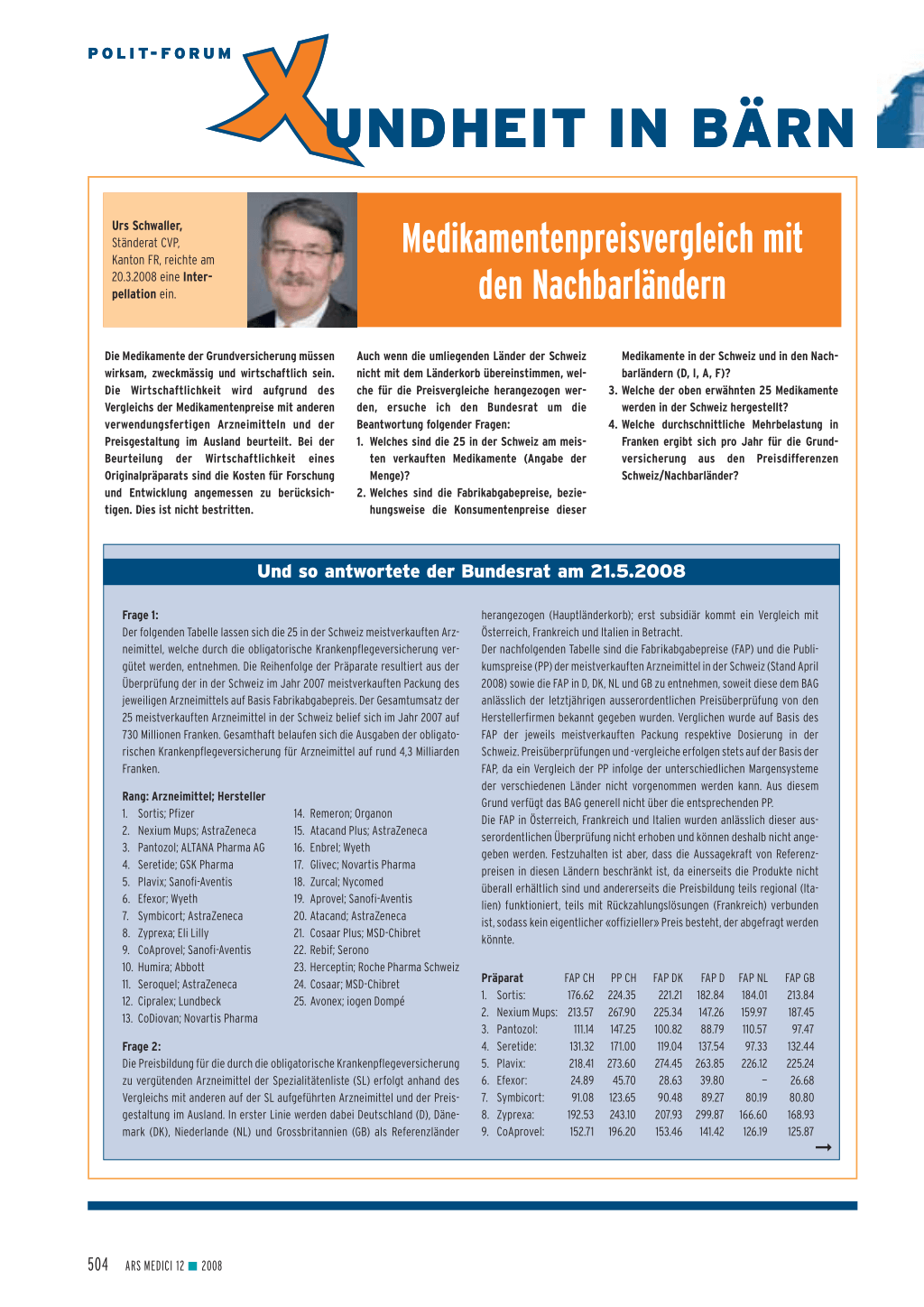 herangezogen (Hauptländerkorb); erst subsidiär kommt ein Vergleich mit Österreich, Frankreich und Italien in Betracht. Der nachfolgenden Tabelle sind die Fabrikabgabepreise (FAP) und die Publikumspreise (PP) der meistverkauften Arzneimittel in der Schweiz (Stand April 2008) sowie die FAP in D, DK, NL und GB zu entnehmen, soweit diese dem BAG anlässlich der letztjährigen ausserordentlichen Preisüberprüfung von den Herstellerfirmen bekannt gegeben wurden. Verglichen wurde auf Basis des FAP der jeweils meistverkauften Packung respektive Dosierung in der Schweiz. Preisüberprüfungen und -vergleiche erfolgen stets auf der Basis der FAP, da ein Vergleich der PP infolge der unterschiedlichen Margensysteme der verschiedenen Länder nicht vorgenommen werden kann. Aus diesem Grund verfügt das BAG generell nicht über die entsprechenden PP. Die FAP in Österreich, Frankreich und Italien wurden anlässlich dieser ausserordentlichen Überprüfung nicht erhoben und können deshalb nicht angegeben werden. Festzuhalten ist aber, dass die Aussagekraft von Referenzpreisen in diesen Ländern beschränkt ist, da einerseits die Produkte nicht überall erhältlich sind und andererseits die Preisbildung teils regional (Italien) funktioniert, teils mit Rückzahlungslösungen (Frankreich) verbunden ist, sodass kein eigentlicher «offizieller» Preis besteht, der abgefragt werden könnte.