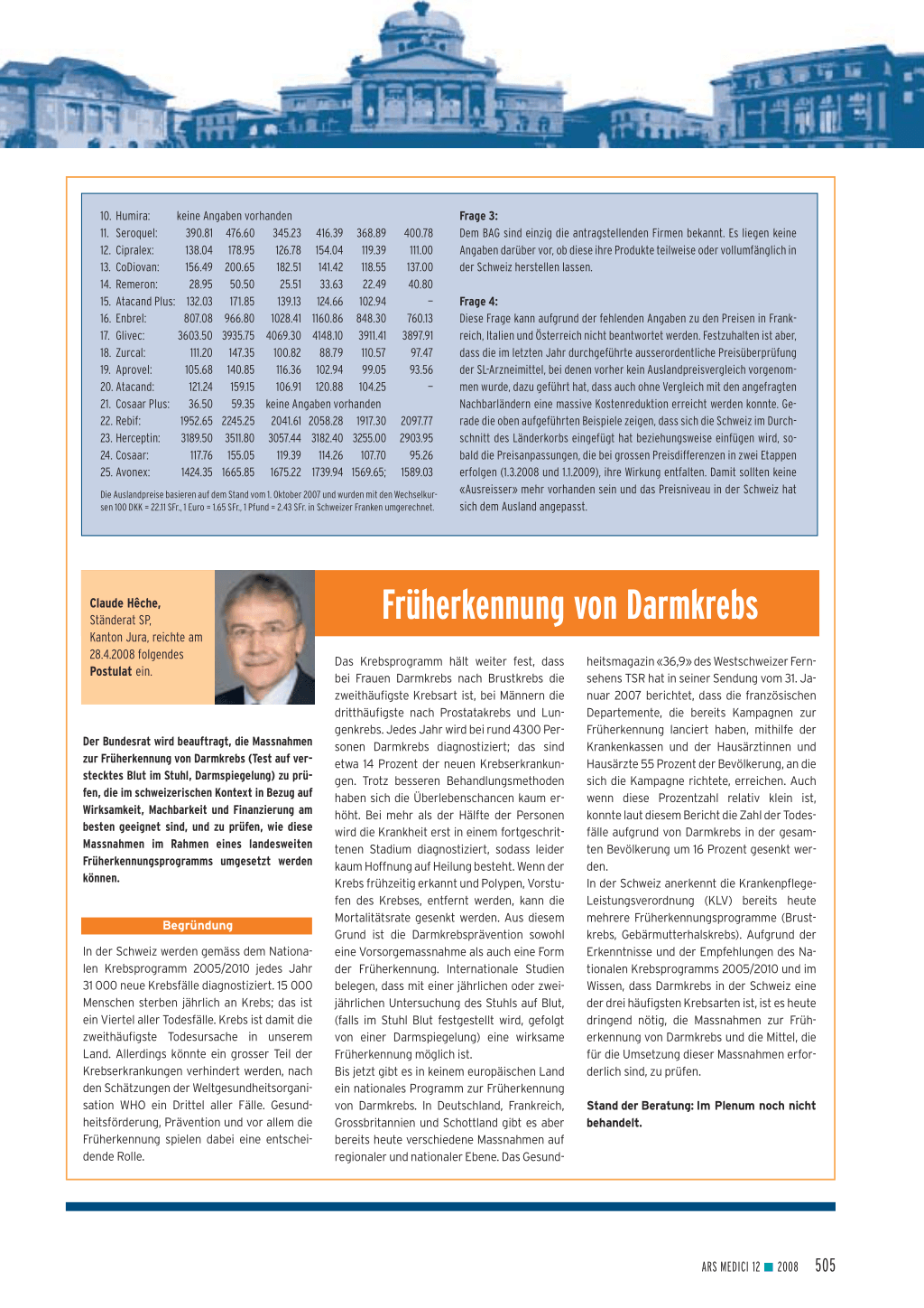 heitsmagazin «36,9» des Westschweizer Fernsehens TSR hat in seiner Sendung vom 31. Januar 2007 berichtet, dass die französischen Departemente, die bereits Kampagnen zur Früherkennung lanciert haben, mithilfe der Krankenkassen und der Hausärztinnen und Hausärzte 55 Prozent der Bevölkerung, an die sich die Kampagne richtete, erreichen. Auch wenn diese Prozentzahl relativ klein ist, konnte laut diesem Bericht die Zahl der Todesfälle aufgrund von Darmkrebs in der gesamten Bevölkerung um 16 Prozent gesenkt werden. In der Schweiz anerkennt die KrankenpflegeLeistungsverordnung (KLV) bereits heute mehrere Früherkennungsprogramme (Brustkrebs, Gebärmutterhalskrebs). Aufgrund der Erkenntnisse und der Empfehlungen des Nationalen Krebsprogramms 2005/2010 und im Wissen, dass Darmkrebs in der Schweiz eine der drei häufigsten Krebsarten ist, ist es heute dringend nötig, die Massnahmen zur Früherkennung von Darmkrebs und die Mittel, die für die Umsetzung dieser Massnahmen erforderlich sind, zu prüfen.