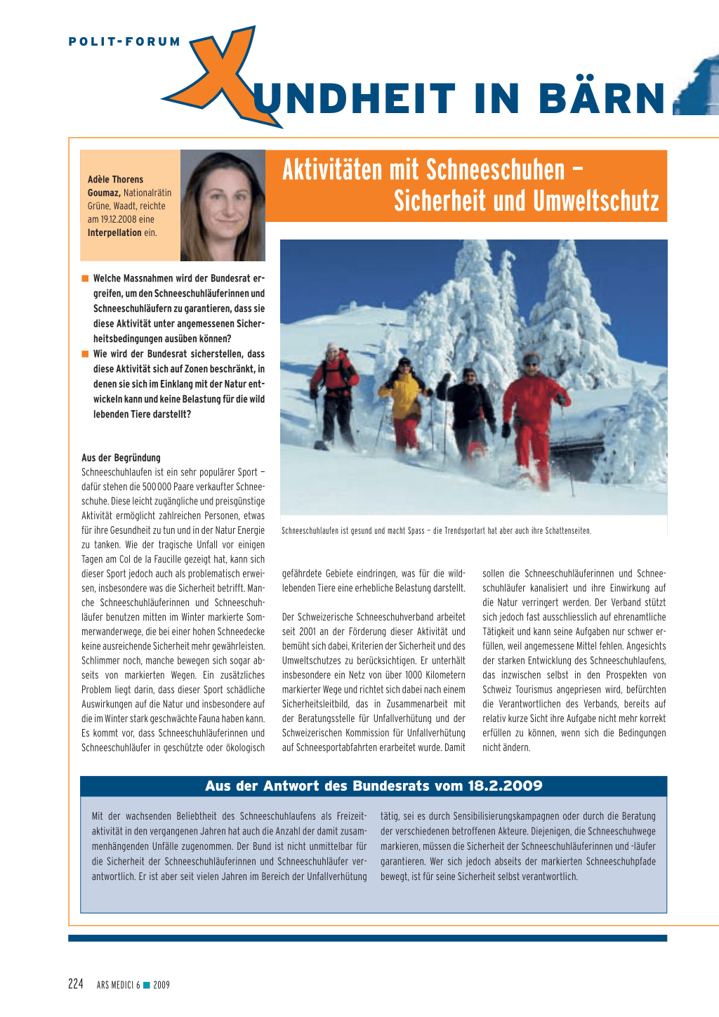 Aus der Begründung Schneeschuhlaufen ist ein sehr populärer Sport — dafür stehen die 500000 Paare verkaufter Schneeschuhe. Diese leicht zugängliche und preisgünstige Aktivität ermöglicht zahlreichen Personen, etwas für ihre Gesundheit zu tun und in der Natur Energie zu tanken. Wie der tragische Unfall vor einigen Tagen am Col de la Faucille gezeigt hat, kann sich dieser Sport jedoch auch als problematisch erweisen, insbesondere was die Sicherheit betrifft. Manche Schneeschuhläuferinnen und Schneeschuhläufer benutzen mitten im Winter markierte Sommerwanderwege, die bei einer hohen Schneedecke keine ausreichende Sicherheit mehr gewährleisten. Schlimmer noch, manche bewegen sich sogar abseits von markierten Wegen. Ein zusätzliches Problem liegt darin, dass dieser Sport schädliche Auswirkungen auf die Natur und insbesondere auf die im Winter stark geschwächte Fauna haben kann. Es kommt vor, dass Schneeschuhläuferinnen und Schneeschuhläufer in geschützte oder ökologisch