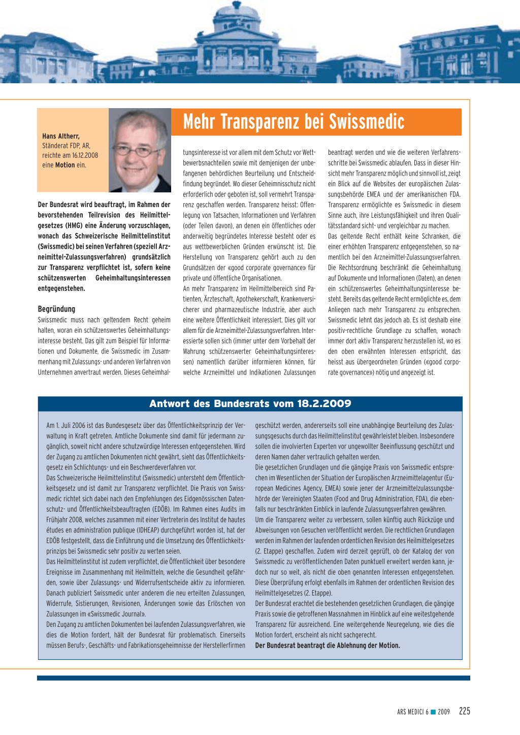 Hans Altherr, Ständerat FDP, AR, reichte am 16.12.2008 eine Motion ein.