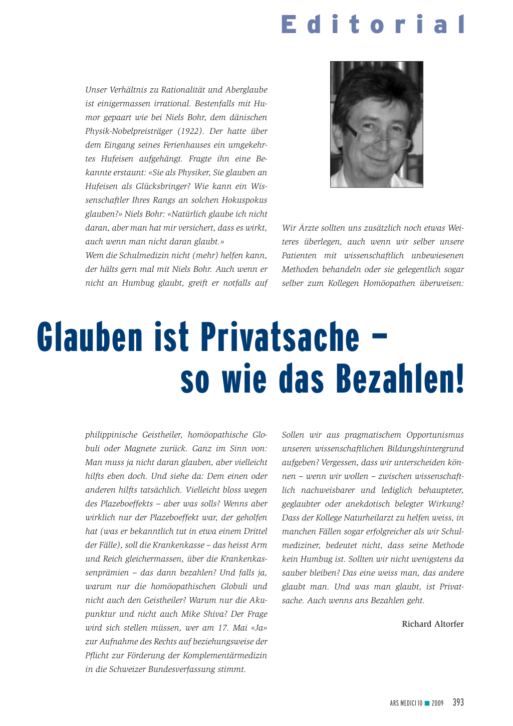 Unser Verhältnis zu Rationalität und Aberglaube ist einigermassen irrational. Bestenfalls mit Humor gepaart wie bei Niels Bohr, dem dänischen Physik-Nobelpreisträger (1922). Der hatte über dem Eingang seines Ferienhauses ein umgekehrtes Hufeisen aufgehängt. Fragte ihn eine Bekannte erstaunt: «Sie als Physiker, Sie glauben an Hufeisen als Glücksbringer? Wie kann ein Wissenschaftler Ihres Rangs an solchen Hokuspokus glauben?» Niels Bohr: «Natürlich glaube ich nicht daran, aber man hat mir versichert, dass es wirkt, auch wenn man nicht daran glaubt.» Wem die Schulmedizin nicht (mehr) helfen kann, der hälts gern mal mit Niels Bohr. Auch wenn er nicht an Humbug glaubt, greift er notfalls auf