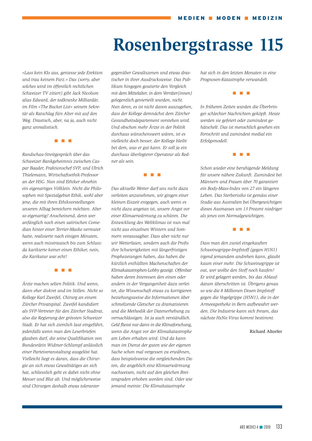 gegenüber Gewaltszenen und etwas drastischer in ihrer Ausdrucksweise. Das Publikum hingegen goutierte den Vergleich mit dem Mittelalter, in dem Verräter(innen) gelegentlich gevierteilt wurden, nicht. Nun denn, es ist nicht davon auszugehen, dass der Kollege demnächst dem Zürcher Gesundheitsdepartement vorstehen wird. Und obschon mehr Ärzte in der Politik durchaus wünschenswert wären, ist es vielleicht doch besser, der Kollege bleibt bei dem, was er gut kann. Er soll ja ein durchaus überlegterer Operateur als Redner als sein.