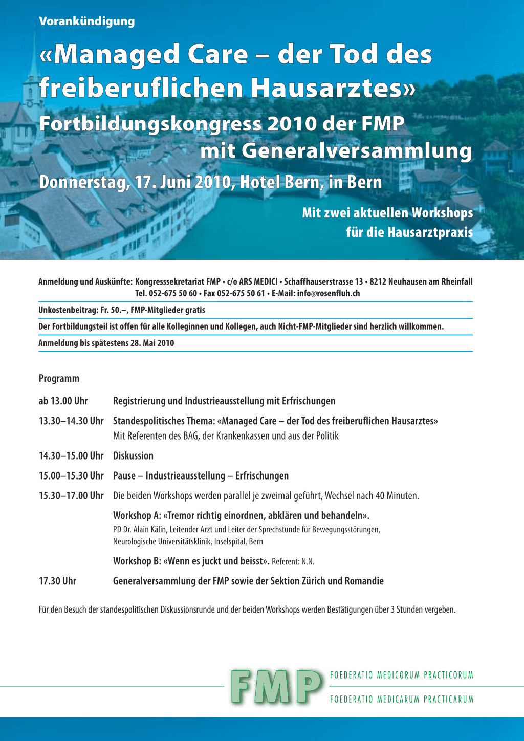 Unkostenbeitrag: Fr. 50.–, FMP-Mitglieder gratis Der Fortbildungsteil ist offen für alle Kolleginnen und Kollegen, auch Nicht-FMP-Mitglieder sind herzlich willkommen. Anmeldung bis spätestens 28. Mai 2010