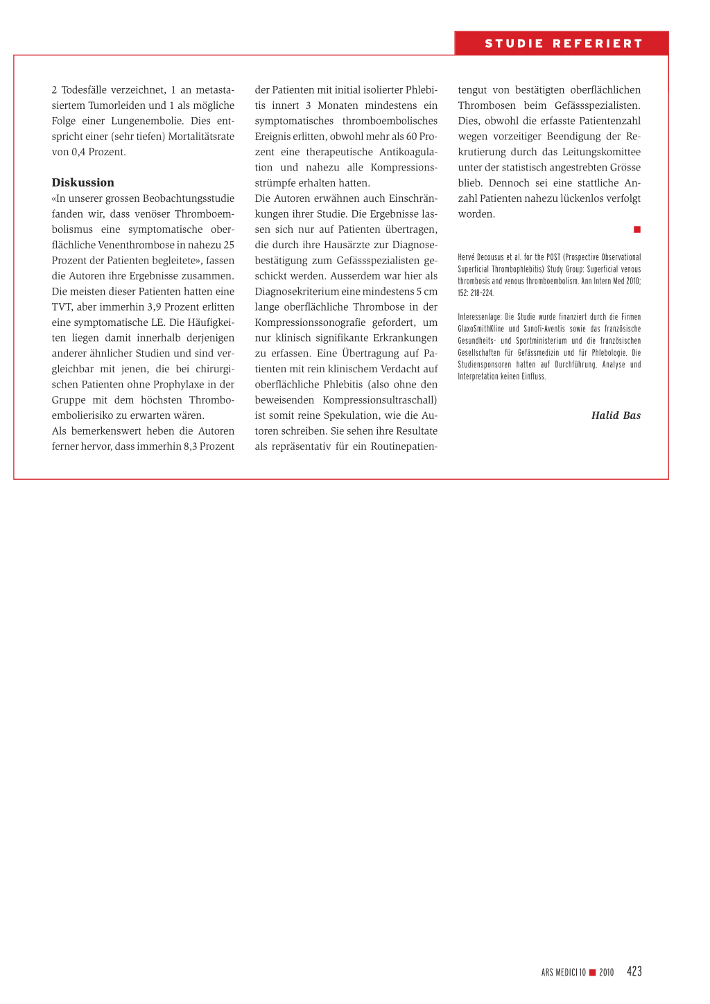 der Patienten mit initial isolierter Phlebitis innert 3 Monaten mindestens ein symptomatisches thromboembolisches Ereignis erlitten, obwohl mehr als 60 Prozent eine therapeutische Antikoagulation und nahezu alle Kompressionsstrümpfe erhalten hatten. Die Autoren erwähnen auch Einschränkungen ihrer Studie. Die Ergebnisse lassen sich nur auf Patienten übertragen, die durch ihre Hausärzte zur Diagnosebestätigung zum Gefässspezialisten geschickt werden. Ausserdem war hier als Diagnosekriterium eine mindestens 5 cm lange oberflächliche Thrombose in der Kompressionssonografie gefordert, um nur klinisch signifikante Erkrankungen zu erfassen. Eine Übertragung auf Patienten mit rein klinischem Verdacht auf oberflächliche Phlebitis (also ohne den beweisenden Kompressionsultraschall) ist somit reine Spekulation, wie die Autoren schreiben. Sie sehen ihre Resultate als repräsentativ für ein Routinepatien-