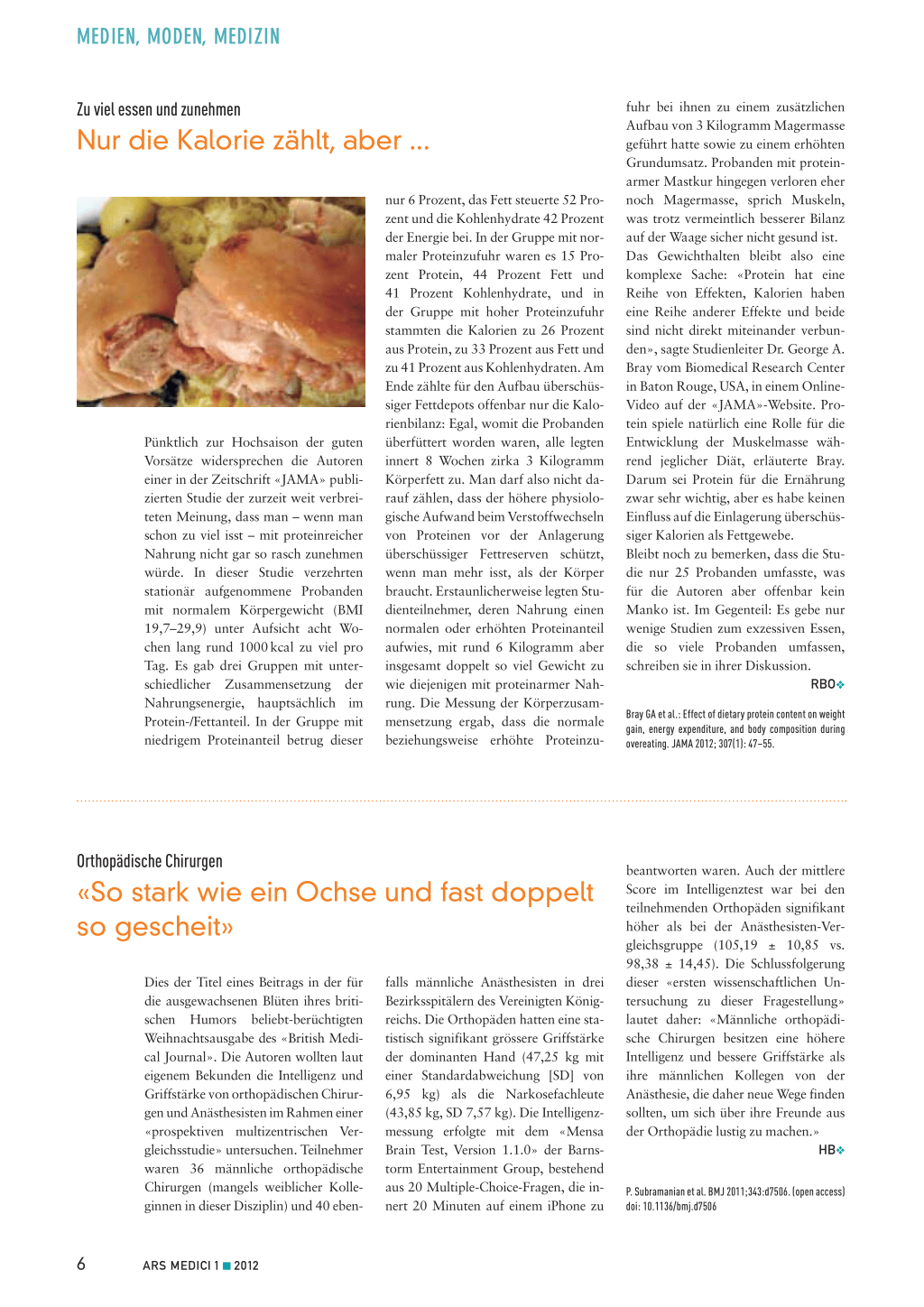 fuhr bei ihnen zu einem zusätzlichen Aufbau von 3 Kilogramm Magermasse geführt hatte sowie zu einem erhöhten Grundumsatz. Probanden mit proteinarmer Mastkur hingegen verloren eher noch Magermasse, sprich Muskeln, was trotz vermeintlich besserer Bilanz auf der Waage sicher nicht gesund ist. Das Gewichthalten bleibt also eine komplexe Sache: «Protein hat eine Reihe von Effekten, Kalorien haben eine Reihe anderer Effekte und beide sind nicht direkt miteinander verbunden», sagte Studienleiter Dr. George A. Bray vom Biomedical Research Center in Baton Rouge, USA, in einem OnlineVideo auf der «JAMA»-Website. Protein spiele natürlich eine Rolle für die Entwicklung der Muskelmasse während jeglicher Diät, erläuterte Bray. Darum sei Protein für die Ernährung zwar sehr wichtig, aber es habe keinen Einfluss auf die Einlagerung überschüssiger Kalorien als Fettgewebe. Bleibt noch zu bemerken, dass die Studie nur 25 Probanden umfasste, was für die Autoren aber offenbar kein Manko ist. Im Gegenteil: Es gebe nur wenige Studien zum exzessiven Essen, die so viele Probanden umfassen, schreiben sie in ihrer Diskussion.