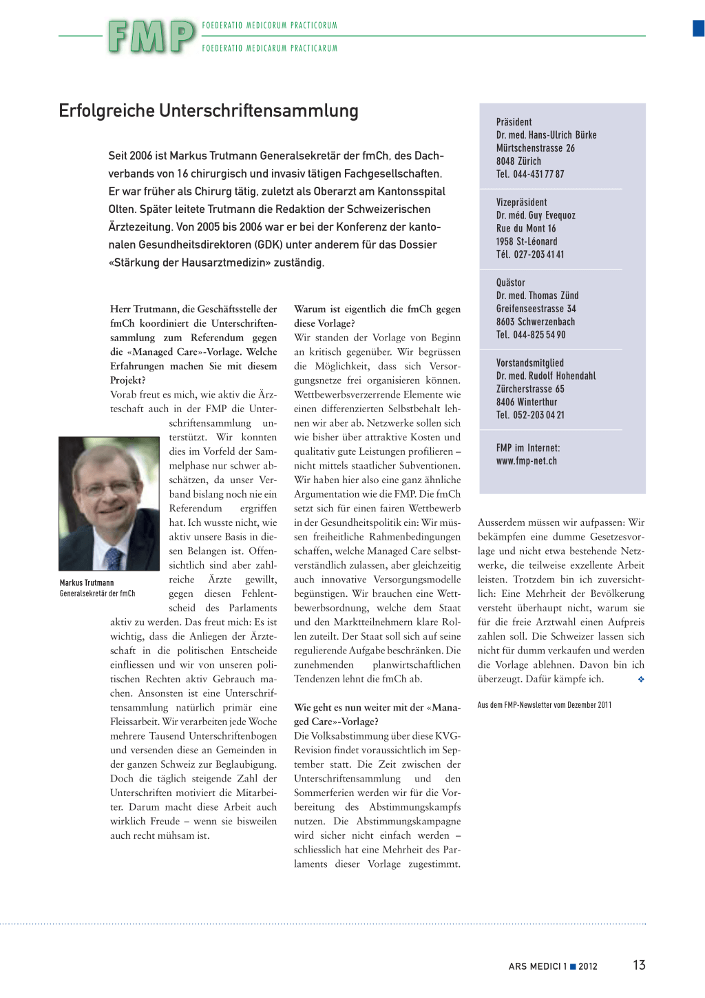 Seit 2006 ist Markus Trutmann Generalsekretär der fmCh, des Dachverbands von 16 chirurgisch und invasiv tätigen Fachgesellschaften. Er war früher als Chirurg tätig, zuletzt als Oberarzt am Kantonsspital Olten. Später leitete Trutmann die Redaktion der Schweizerischen Ärztezeitung. Von 2005 bis 2006 war er bei der Konferenz der kantonalen Gesundheitsdirektoren (GDK) unter anderem für das Dossier «Stärkung der Hausarztmedizin» zuständig.