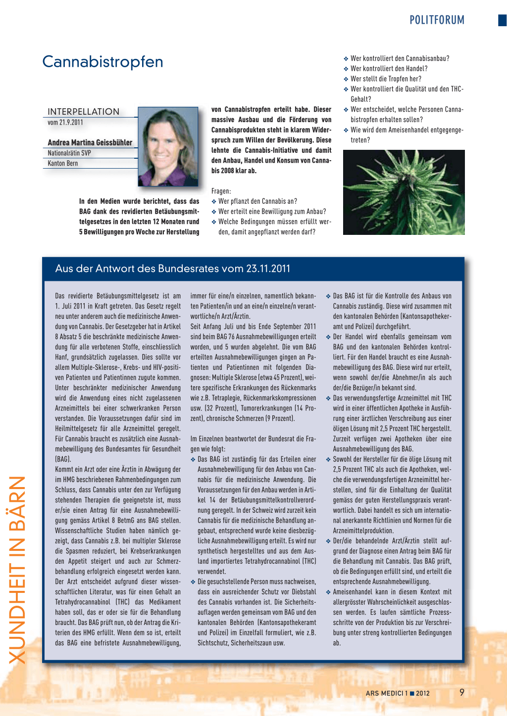 von Cannabistropfen erteilt habe. Dieser massive Ausbau und die Förderung von Cannabisprodukten steht in klarem Widerspruch zum Willen der Bevölkerung. Diese lehnte die Cannabis-Initiative und damit den Anbau, Handel und Konsum von Cannabis 2008 klar ab.