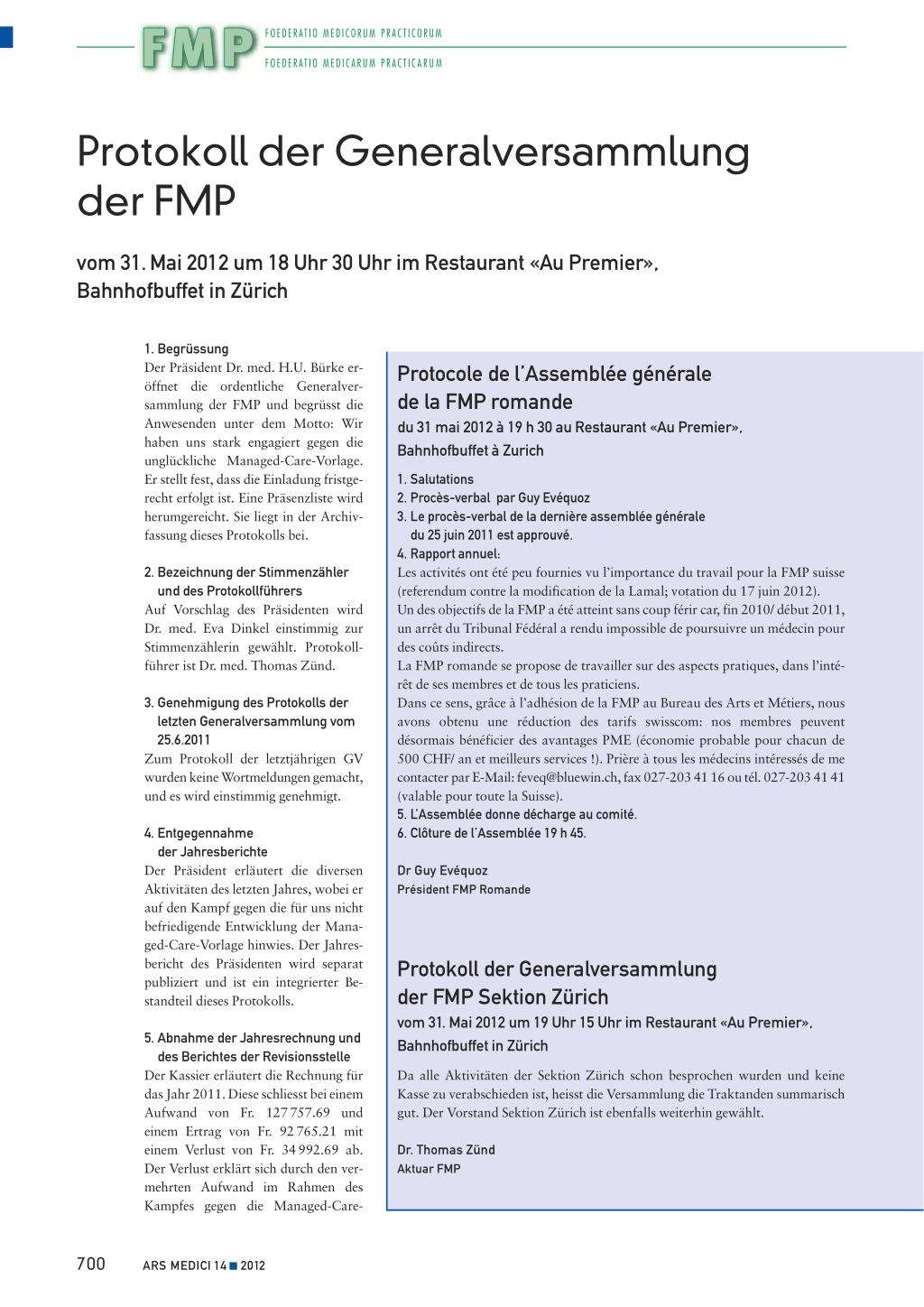 du 25 juin 2011 est approuvé. 4. Rapport annuel: Les activités ont été peu fournies vu l’importance du travail pour la FMP suisse (referendum contre la modification de la Lamal; votation du 17 juin 2012). Un des objectifs de la FMP a été atteint sans coup férir car, fin 2010/ début 2011, un arrêt du Tribunal Fédéral a rendu impossible de poursuivre un médecin pour des coûts indirects. La FMP romande se propose de travailler sur des aspects pratiques, dans l’intérêt de ses membres et de tous les praticiens. Dans ce sens, grâce à l’adhésion de la FMP au Bureau des Arts et Métiers, nous avons obtenu une réduction des tarifs swisscom: nos membres peuvent désormais bénéficier des avantages PME (économie probable pour chacun de 500 CHF/ an et meilleurs services !). Prière à tous les médecins intéressés de me contacter par E-Mail: feveq@bluewin.ch, fax 027-203 41 16 ou tél. 027-203 41 41 (valable pour toute la Suisse). 5. L’Assemblée donne décharge au comité. 6. Clôture de l’Assemblée 19 h 45.