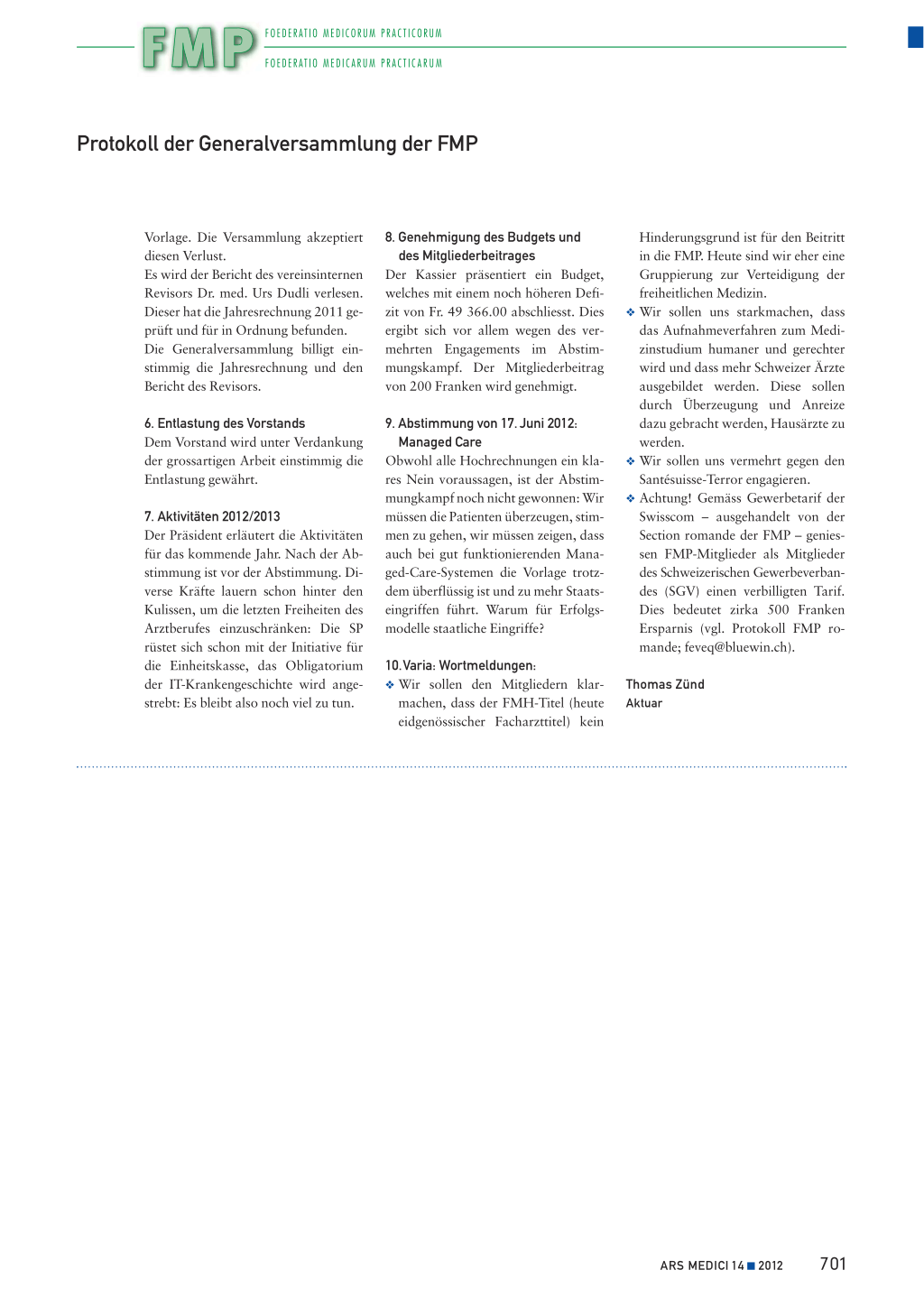 Hinderungsgrund ist für den Beitritt in die FMP. Heute sind wir eher eine Gruppierung zur Verteidigung der freiheitlichen Medizin. ❖ Wir sollen uns starkmachen, dass das Aufnahmeverfahren zum Medizinstudium humaner und gerechter wird und dass mehr Schweizer Ärzte ausgebildet werden. Diese sollen durch Überzeugung und Anreize dazu gebracht werden, Hausärzte zu werden. ❖ Wir sollen uns vermehrt gegen den Santésuisse-Terror engagieren. ❖ Achtung! Gemäss Gewerbetarif der Swisscom – ausgehandelt von der Section romande der FMP – geniessen FMP-Mitglieder als Mitglieder des Schweizerischen Gewerbeverbandes (SGV) einen verbilligten Tarif. Dies bedeutet zirka 500 Franken Ersparnis (vgl. Protokoll FMP romande; feveq@bluewin.ch).
