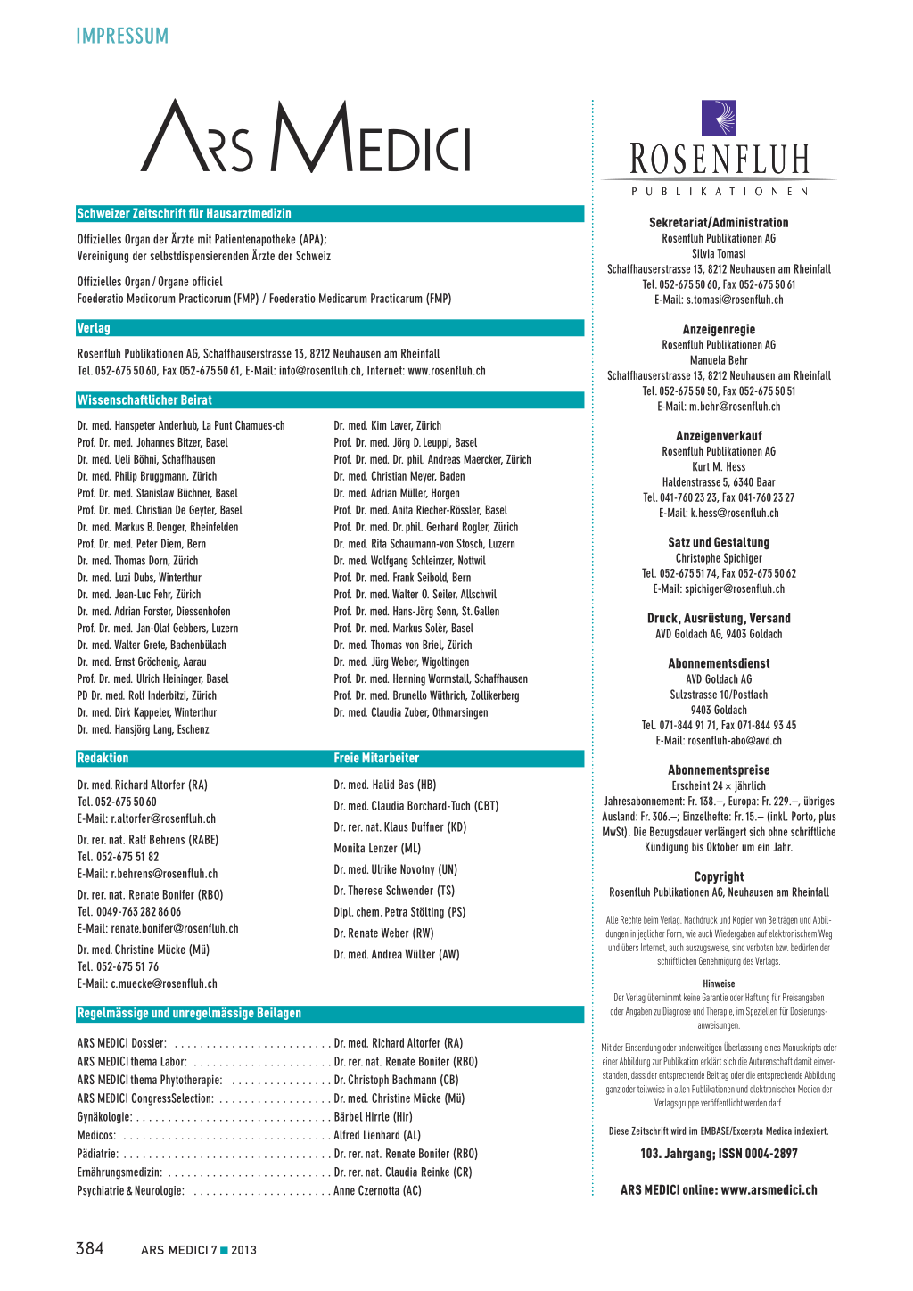 ARS MEDICI Dossier: . . . . . . . . . . . . . . . . . . . . . . . . . Dr. med. Richard Altorfer (RA) ARS MEDICI thema Labor: . . . . . . . . . . . . . . . . . . . . . . Dr. rer. nat. Renate Bonifer (RBO) ARS MEDICI thema Phytotherapie: . . . . . . . . . . . . . . . . Dr. Christoph Bachmann (CB) ARS MEDICI CongressSelection: . . . . . . . . . . . . . . . . . . Dr. med. Christine Mücke (Mü) Gynäkologie: . . . . . . . . . . . . . . . . . . . . . . . . . . . . . . . Bärbel Hirrle (Hir) Medicos: . . . . . . . . . . . . . . . . . . . . . . . . . . . . . . . . . Alfred Lienhard (AL) Pädiatrie: . . . . . . . . . . . . . . . . . . . . . . . . . . . . . . . . . Dr. rer. nat. Renate Bonifer (RBO) Ernährungsmedizin: . . . . . . . . . . . . . . . . . . . . . . . . . . Dr. rer. nat. Claudia Reinke (CR) Psychiatrie & Neurologie: . . . . . . . . . . . . . . . . . . . . . . Anne Czernotta (AC)