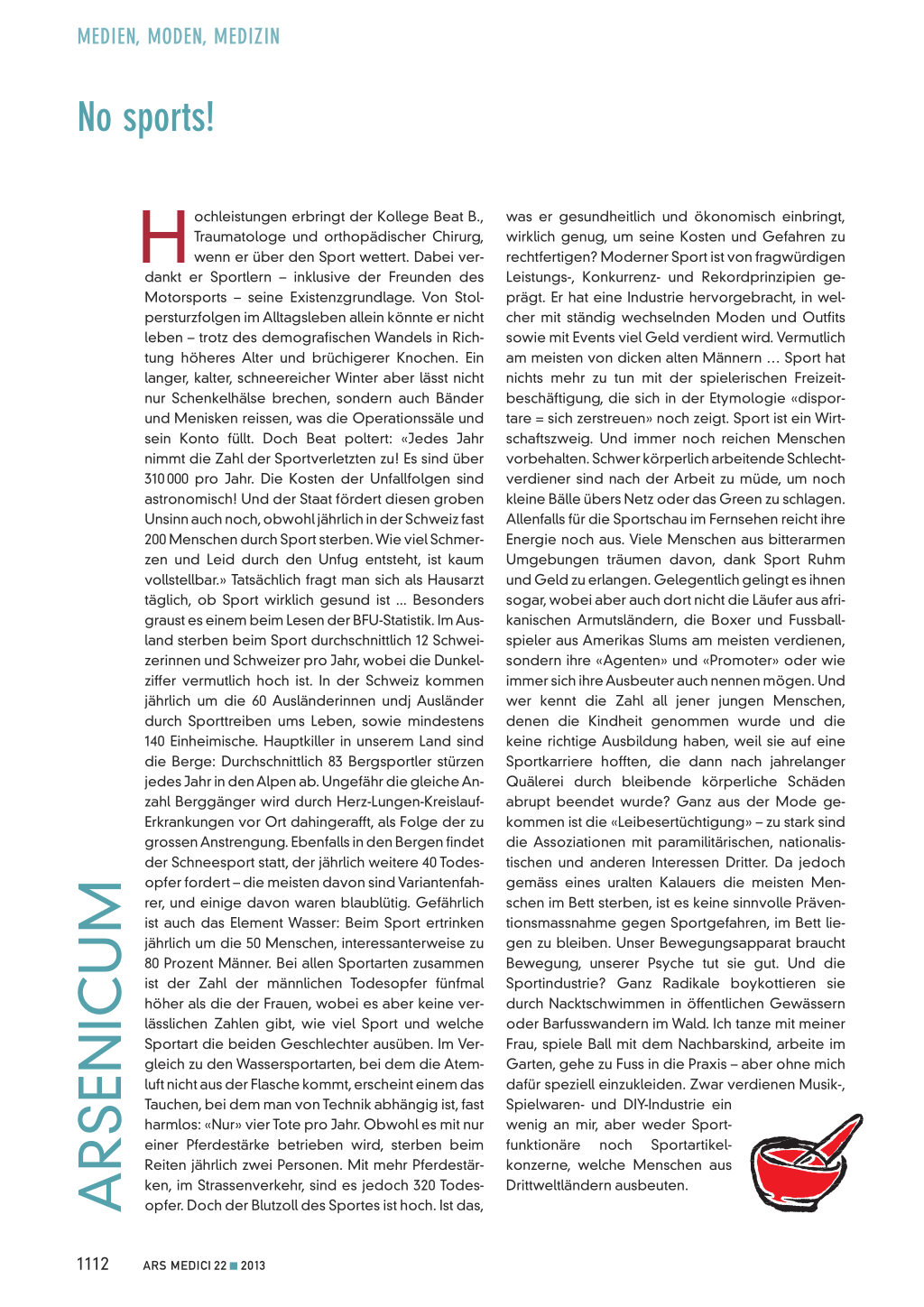 H ochleistungen erbringt der Kollege Beat B., Traumatologe und orthopädischer Chirurg, wenn er über den Sport wettert. Dabei verdankt er Sportlern – inklusive der Freunden des Motorsports – seine Existenzgrundlage. Von Stolpersturzfolgen im Alltagsleben allein könnte er nicht leben – trotz des demografischen Wandels in Richtung höheres Alter und brüchigerer Knochen. Ein langer, kalter, schneereicher Winter aber lässt nicht nur Schenkelhälse brechen, sondern auch Bänder und Menisken reissen, was die Operationssäle und sein Konto füllt. Doch Beat poltert: «Jedes Jahr nimmt die Zahl der Sportverletzten zu! Es sind über 310 000 pro Jahr. Die Kosten der Unfallfolgen sind astronomisch! Und der Staat fördert diesen groben Unsinn auch noch, obwohl jährlich in der Schweiz fast 200 Menschen durch Sport sterben. Wie viel Schmerzen und Leid durch den Unfug entsteht, ist kaum vollstellbar.» Tatsächlich fragt man sich als Hausarzt täglich, ob Sport wirklich gesund ist ... Besonders graust es einem beim Lesen der BFU-Statistik. Im Ausland sterben beim Sport durchschnittlich 12 Schweizerinnen und Schweizer pro Jahr, wobei die Dunkelziffer vermutlich hoch ist. In der Schweiz kommen jährlich um die 60 Ausländerinnen undj Ausländer durch Sporttreiben ums Leben, sowie mindestens 140 Einheimische. Hauptkiller in unserem Land sind die Berge: Durchschnittlich 83 Bergsportler stürzen jedes Jahr in den Alpen ab. Ungefähr die gleiche Anzahl Berggänger wird durch Herz-Lungen-KreislaufErkrankungen vor Ort dahingerafft, als Folge der zu grossen Anstrengung. Ebenfalls in den Bergen findet der Schneesport statt, der jährlich weitere 40 Todesopfer fordert – die meisten davon sind Variantenfahrer, und einige davon waren blaublütig. Gefährlich ist auch das Element Wasser: Beim Sport ertrinken jährlich um die 50 Menschen, interessanterweise zu 80 Prozent Männer. Bei allen Sportarten zusammen ist der Zahl der männlichen Todesopfer fünfmal höher als die der Frauen, wobei es aber keine verlässlichen Zahlen gibt, wie viel Sport und welche Sportart die beiden Geschlechter ausüben. Im Vergleich zu den Wassersportarten, bei dem die Atemluft nicht aus der Flasche kommt, erscheint einem das Tauchen, bei dem man von Technik abhängig ist, fast harmlos: «Nur» vier Tote pro Jahr. Obwohl es mit nur einer Pferdestärke betrieben wird, sterben beim Reiten jährlich zwei Personen. Mit mehr Pferdestärken, im Strassenverkehr, sind es jedoch 320 Todesopfer. Doch der Blutzoll des Sportes ist hoch. Ist das,