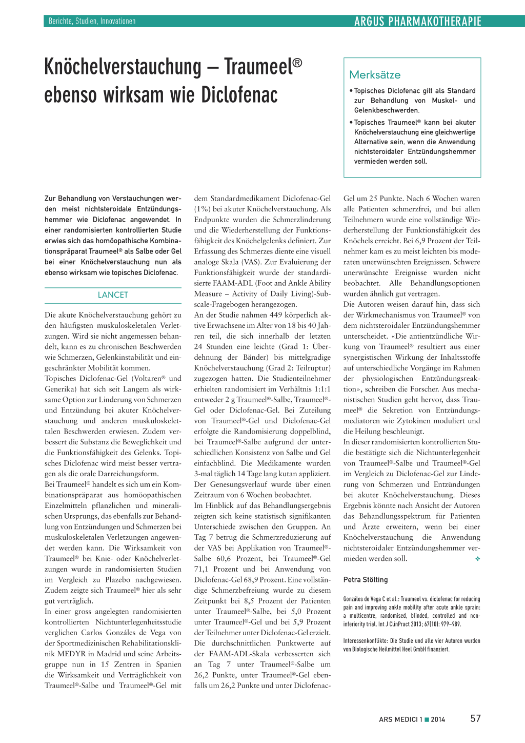 Gonzáles de Vega C et al.: Traumeel vs. diclofenac for reducing pain and improving ankle mobility after acute ankle sprain: a multicentre, randomised, blinded, controlled and noninferiority trial. Int J ClinPract 2013; 67(10): 979–989.
