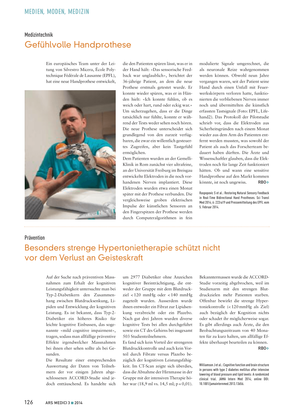 Raspopovic S et al.: Restoring Natural Sensory Feedback in Real-Time Bidirectional Hand Prostheses. Sci Transl Med 2014; 6: 222ra19 und Pressemitteilung des EPFL vom 5. Februar 2014.