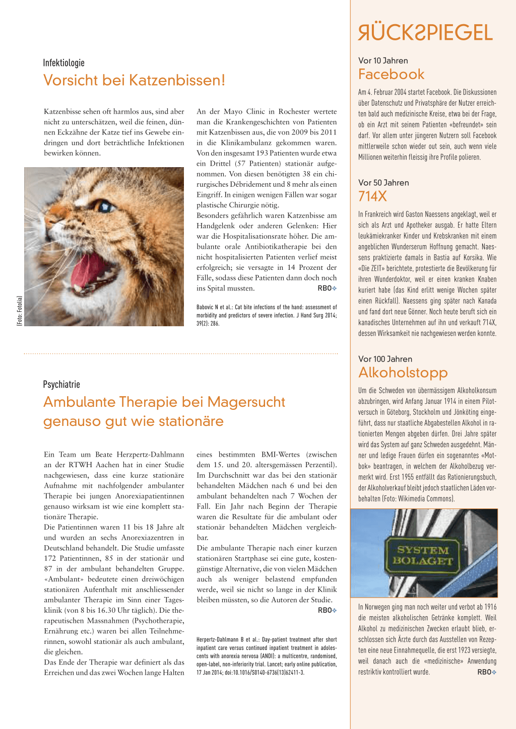 um 2977 Diabetiker ohne Anzeichen kognitiver Beeinträchtigung, die entweder der Gruppe mit dem Blutdruckziel < 120 mmHg oder < 140 mmHg zugeteilt wurden. Ausserdem wurde ihnen entweder ein Fibrat zur Lipidsenkung verabreicht oder ein Plazebo. Nach gut drei Jahren wurden diverse kognitive Tests bei allen durchgeführt sowie ein CT des Gehirns bei insgesamt 503 Studienteilnehmern. Es fand sich kein Vorteil der strengeren Blutdruckkontrolle und auch kein Vorteil durch Fibrate versus Plazebo bezüglich der kognitiven Leistungsfähigkeit. Im CT-Scan zeigte sich überdies, dass die Abnahme der Hirnmasse in der Gruppe mit der intensiven Therapie höher war (18,9 ml vs. 14,5 ml; p = 0,01). Bekanntermassen wurde die ACCORDStudie vorzeitig abgebrochen, weil im Studienarm mit den strengen Blutdruckzielen mehr Patienten starben. Offenbar bewirkt die strenge Hypertoniekontrolle (< 120 mmHg als Ziel) auch bezüglich der Kognition nichts oder schadet ihr möglicherweise sogar. Es gibt allerdings auch Ärzte, die den Beobachtungszeitraum von 40 Monaten für zu kurz halten, um allfällige Effekte überhaupt beurteilen zu können. RBOO Williamson J et al.: Cognitive function and brain structure in persons with type 2 diabetes mellitus after intensive lowering of blood pressure and lipid levels: A randomized clinical trial. JAMA Intern Med 2014; online DOI: 10.1001/jamainternmed.2013.13656. 126 ARS MEDICI 3 I 2014 RÜCKSPIEGEL Infektiologie Vorsicht bei Katzenbissen! Katzenbisse sehen oft harmlos aus, sind aber nicht zu unterschätzen, weil die feinen, dünnen Eckzähne der Katze tief ins Gewebe eindringen und dort beträchtliche Infektionen bewirken können. An der Mayo Clinic in Rochester wertete man die Krankengeschichten von Patienten mit Katzenbissen aus, die von 2009 bis 2011 in die Klinikambulanz gekommen waren. Von den insgesamt 193 Patienten wurde etwa ein Drittel (57 Patienten) stationär aufge- nommen. Von diesen benötigten 38 ein chi- rurgisches Débridement und 8 mehr als einen Eingriff. In einigen wenigen Fällen war sogar plastische Chirurgie nötig. Besonders gefährlich waren Katzenbisse am Handgelenk oder anderen Gelenken: Hier war die Hospitalisationsrate höher. Die am- bulante orale Antibiotikatherapie bei den nicht hospitalisierten Patienten verlief meist erfolgreich; sie versagte in 14 Prozent der Fälle, sodass diese Patienten dann doch noch ins Spital mussten. RBOO Babovic N et al.: Cat bite infections of the hand: assessment of morbidity and predictors of severe infection. J Hand Surg 2014; 39(2): 286. Vor 10 Jahren Facebook Am 4. Februar 2004 startet Facebook. Die Diskussionen über Datenschutz und Privatsphäre der Nutzer erreichten bald auch medizinische Kreise, etwa bei der Frage, ob ein Arzt mit seinem Patienten «befreundet» sein darf. Vor allem unter jüngeren Nutzern soll Facebook mittlerweile schon wieder out sein, auch wenn viele Millionen weiterhin fleissig ihre Profile polieren. Vor 50 Jahren 714X In Frankreich wird Gaston Naessens angeklagt, weil er sich als Arzt und Apotheker ausgab. Er hatte Eltern leukämiekranker Kinder und Krebskranken mit einem angeblichen Wunderserum Hoffnung gemacht. Naessens praktizierte damals in Bastia auf Korsika. Wie «Die ZEIT» berichtete, protestierte die Bevölkerung für ihren Wunderdoktor, weil er einen kranken Knaben kuriert habe (das Kind erlitt wenige Wochen später einen Rückfall). Naessens ging später nach Kanada und fand dort neue Gönner. Noch heute beruft sich ein kanadisches Unternehmen auf ihn und verkauft 714X, dessen Wirksamkeit nie nachgewiesen werden konnte. (Foto: Fotolia) Psychiatrie Ambulante Therapie bei Magersucht genauso gut wie stationäre Ein Team um Beate Herzpertz-Dahlmann an der RTWH Aachen hat in einer Studie nachgewiesen, dass eine kurze stationäre Aufnahme mit nachfolgender ambulanter Therapie bei jungen Anorexiapatientinnen genauso wirksam ist wie eine komplett stationäre Therapie. Die Patientinnen waren 11 bis 18 Jahre alt und wurden an sechs Anorexiazentren in Deutschland behandelt. Die Studie umfasste 172 Patientinnen, 85 in der stationär und 87 in der ambulant behandelten Gruppe. «Ambulant» bedeutete einen dreiwöchigen stationären Aufenthalt mit anschliessender ambulanter Therapie im Sinn einer Tagesklinik (von 8 bis 16.30 Uhr täglich). Die therapeutischen Massnahmen (Psychotherapie, Ernährung etc.) waren bei allen Teilnehmerinnen, sowohl stationär als auch ambulant, die gleichen. Das Ende der Therapie war definiert als das Erreichen und das zwei Wochen lange Halten eines bestimmten BMI-Wertes (zwischen dem 15. und 20. altersgemässen Perzentil). Im Durchschnitt war das bei den stationär behandelten Mädchen nach 6 und bei den ambulant behandelten nach 7 Wochen der Fall. Ein Jahr nach Beginn der Therapie waren die Resultate für die ambulant oder stationär behandelten Mädchen vergleichbar. Die ambulante Therapie nach einer kurzen stationären Startphase sei eine gute, kostengünstige Alternative, die von vielen Mädchen auch als weniger belastend empfunden werde, weil sie nicht so lange in der Klinik bleiben müssten, so die Autoren der Studie. RBOO Herpertz-Dahlmann B et al.: Day-patient treatment after short inpatient care versus continued inpatient treatment in adolescents with anorexia nervosa (ANDI): a multicentre, randomised, open-label, non-inferiority trial. Lancet; early online publication, 17 Jan 2014; doi:10.1016/S0140-6736(13)62411-3. Vor 100 Jahren Alkoholstopp Um die Schweden von übermässigem Alkoholkonsum abzubringen, wird Anfang Januar 1914 in einem Pilotversuch in Göteborg, Stockholm und Jönköting eingeführt, dass nur staatliche Abgabestellen Alkohol in rationierten Mengen abgeben dürfen. Drei Jahre später wird das System auf ganz Schweden ausgedehnt. Männer und ledige Frauen dürfen ein sogenanntes «Motbok» beantragen, in welchem der Alkoholbezug vermerkt wird. Erst 1955 entfällt das Rationierungsbuch, der Alkoholverkauf bleibt jedoch staatlichen Läden