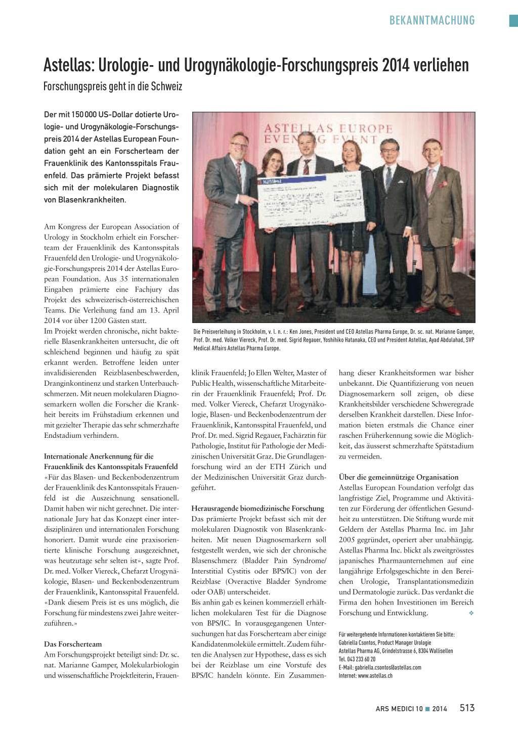 Am Kongress der European Association of Urology in Stockholm erhielt ein Forscherteam der Frauenklinik des Kantonsspitals Frauenfeld den Urologie- und Urogynäkologie-Forschungspreis 2014 der Astellas European Foundation. Aus 35 internationalen Eingaben prämierte eine Fachjury das Projekt des schweizerisch-österreichischen Teams. Die Verleihung fand am 13. April 2014 vor über 1200 Gästen statt. Im Projekt werden chronische, nicht bakterielle Blasenkrankheiten untersucht, die oft schleichend beginnen und häufig zu spät erkannt werden. Betroffene leiden unter invalidisierenden Reizblasenbeschwerden, Dranginkontinenz und starken Unterbauchschmerzen. Mit neuen molekularen Diagnosemarkern wollen die Forscher die Krankheit bereits im Frühstadium erkennen und mit gezielter Therapie das sehr schmerzhafte Endstadium verhindern.