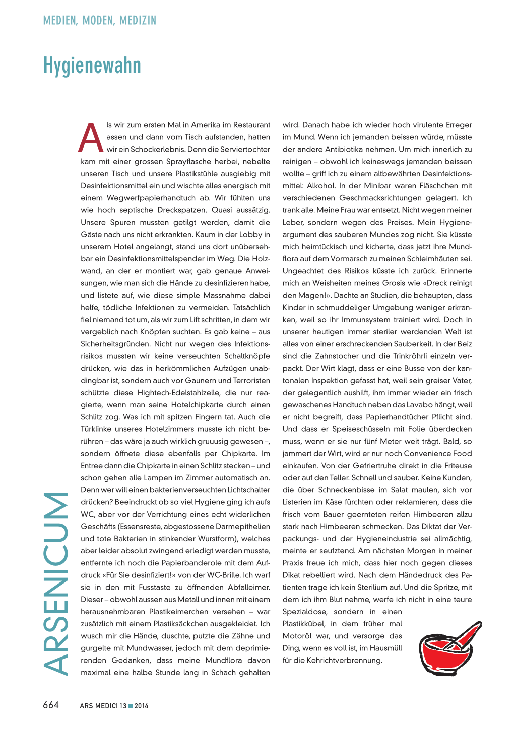 wird. Danach habe ich wieder hoch virulente Erreger im Mund. Wenn ich jemanden beissen würde, müsste der andere Antibiotika nehmen. Um mich innerlich zu reinigen – obwohl ich keineswegs jemanden beissen wollte – griff ich zu einem altbewährten Desinfektionsmittel: Alkohol. In der Minibar waren Fläschchen mit verschiedenen Geschmacksrichtungen gelagert. Ich trank alle. Meine Frau war entsetzt. Nicht wegen meiner Leber, sondern wegen des Preises. Mein Hygieneargument des sauberen Mundes zog nicht. Sie küsste mich heimtückisch und kicherte, dass jetzt ihre Mundflora auf dem Vormarsch zu meinen Schleimhäuten sei. Ungeachtet des Risikos küsste ich zurück. Erinnerte mich an Weisheiten meines Grosis wie «Dreck reinigt den Magen!». Dachte an Studien, die behaupten, dass Kinder in schmuddeliger Umgebung weniger erkranken, weil so ihr Immunsystem trainiert wird. Doch in unserer heutigen immer steriler werdenden Welt ist alles von einer erschreckenden Sauberkeit. In der Beiz sind die Zahnstocher und die Trinkröhrli einzeln verpackt. Der Wirt klagt, dass er eine Busse von der kantonalen Inspektion gefasst hat, weil sein greiser Vater, der gelegentlich aushilft, ihm immer wieder ein frisch gewaschenes Handtuch neben das Lavabo hängt, weil er nicht begreift, dass Papierhandtücher Pflicht sind. Und dass er Speiseschüsseln mit Folie überdecken muss, wenn er sie nur fünf Meter weit trägt. Bald, so jammert der Wirt, wird er nur noch Convenience Food einkaufen. Von der Gefriertruhe direkt in die Friteuse oder auf den Teller. Schnell und sauber. Keine Kunden, die über Schneckenbisse im Salat maulen, sich vor Listerien im Käse fürchten oder reklamieren, dass die frisch vom Bauer geernteten reifen Himbeeren allzu stark nach Himbeeren schmecken. Das Diktat der Verpackungs- und der Hygieneindustrie sei allmächtig, meinte er seufztend. Am nächsten Morgen in meiner Praxis freue ich mich, dass hier noch gegen dieses Dikat rebelliert wird. Nach dem Händedruck des Patienten trage ich kein Sterilium auf. Und die Spritze, mit dem ich ihm Blut nehme, werfe ich nicht in eine teure Spezialdose, sondern in einen Plastikkübel, in dem früher mal Motoröl war, und versorge das Ding, wenn es voll ist, im Hausmüll für die Kehrichtverbrennung.