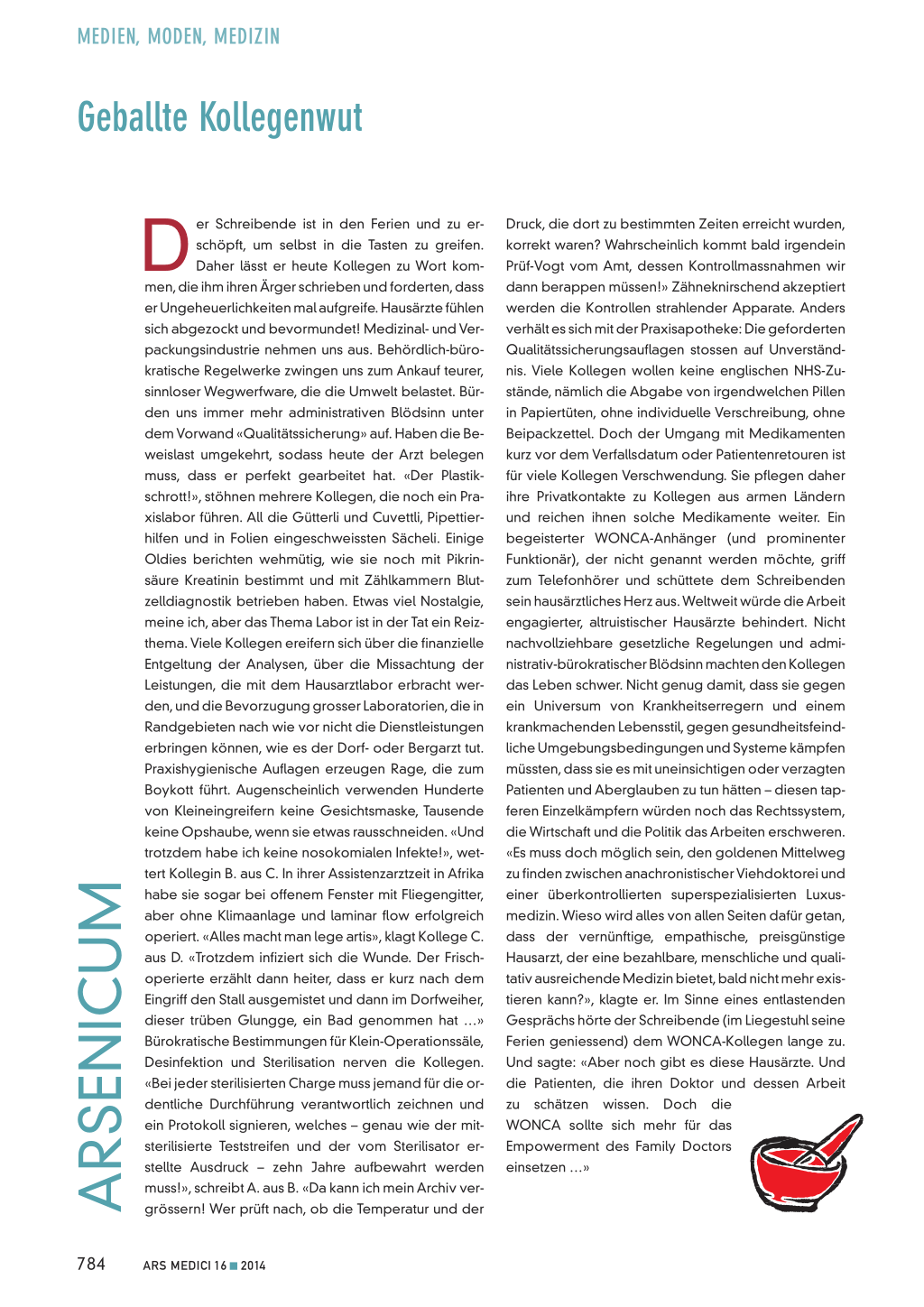 Druck, die dort zu bestimmten Zeiten erreicht wurden, korrekt waren? Wahrscheinlich kommt bald irgendein Prüf-Vogt vom Amt, dessen Kontrollmassnahmen wir dann berappen müssen!» Zähneknirschend akzeptiert werden die Kontrollen strahlender Apparate. Anders verhält es sich mit der Praxisapotheke: Die geforderten Qualitätssicherungsauflagen stossen auf Unverständnis. Viele Kollegen wollen keine englischen NHS-Zustände, nämlich die Abgabe von irgendwelchen Pillen in Papiertüten, ohne individuelle Verschreibung, ohne Beipackzettel. Doch der Umgang mit Medikamenten kurz vor dem Verfallsdatum oder Patientenretouren ist für viele Kollegen Verschwendung. Sie pflegen daher ihre Privatkontakte zu Kollegen aus armen Ländern und reichen ihnen solche Medikamente weiter. Ein begeisterter WONCA-Anhänger (und prominenter Funktionär), der nicht genannt werden möchte, griff zum Telefonhörer und schüttete dem Schreibenden sein hausärztliches Herz aus. Weltweit würde die Arbeit engagierter, altruistischer Hausärzte behindert. Nicht nachvollziehbare gesetzliche Regelungen und administrativ-bürokratischer Blödsinn machten den Kollegen das Leben schwer. Nicht genug damit, dass sie gegen ein Universum von Krankheitserregern und einem krankmachenden Lebensstil, gegen gesundheitsfeindliche Umgebungsbedingungen und Systeme kämpfen müssten, dass sie es mit uneinsichtigen oder verzagten Patienten und Aberglauben zu tun hätten – diesen tapferen Einzelkämpfern würden noch das Rechtssystem, die Wirtschaft und die Politik das Arbeiten erschweren. «Es muss doch möglich sein, den goldenen Mittelweg zu finden zwischen anachronistischer Viehdoktorei und einer überkontrollierten superspezialisierten Luxusmedizin. Wieso wird alles von allen Seiten dafür getan, dass der vernünftige, empathische, preisgünstige Hausarzt, der eine bezahlbare, menschliche und qualitativ ausreichende Medizin bietet, bald nicht mehr existieren kann?», klagte er. Im Sinne eines entlastenden Gesprächs hörte der Schreibende (im Liegestuhl seine Ferien geniessend) dem WONCA-Kollegen lange zu. Und sagte: «Aber noch gibt es diese Hausärzte. Und die Patienten, die ihren Doktor und dessen Arbeit zu schätzen wissen. Doch die WONCA sollte sich mehr für das Empowerment des Family Doctors einsetzen …»