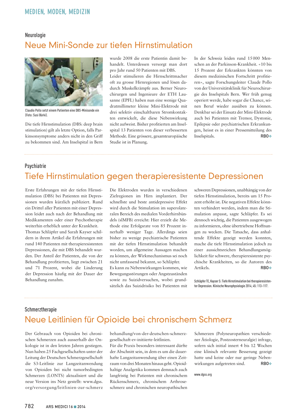 wurde 2008 die erste Patientin damit behandelt. Unterdessen versorgt man dort pro Jahr rund 50 Patienten mit DBS. Leider stimulieren die Hirnschrittmacher oft zu grosse Hirnregionen und lösen dadurch Muskelkrämpfe aus. Berner Neurochirurgen und Ingenieure der ETH Lausanne (EPFL) haben nun eine wenige Quadratmillimeter kleine Mini-Elektrode mit drei selektiv einschaltbaren Stromkontakten entwickelt, die diese Nebenwirkung nicht aufweist. Bisher profitierten am Inselspital 13 Patienten von dieser verbesserten Methode. Eine grössere, gesamteuropäische Studie ist in Planung.