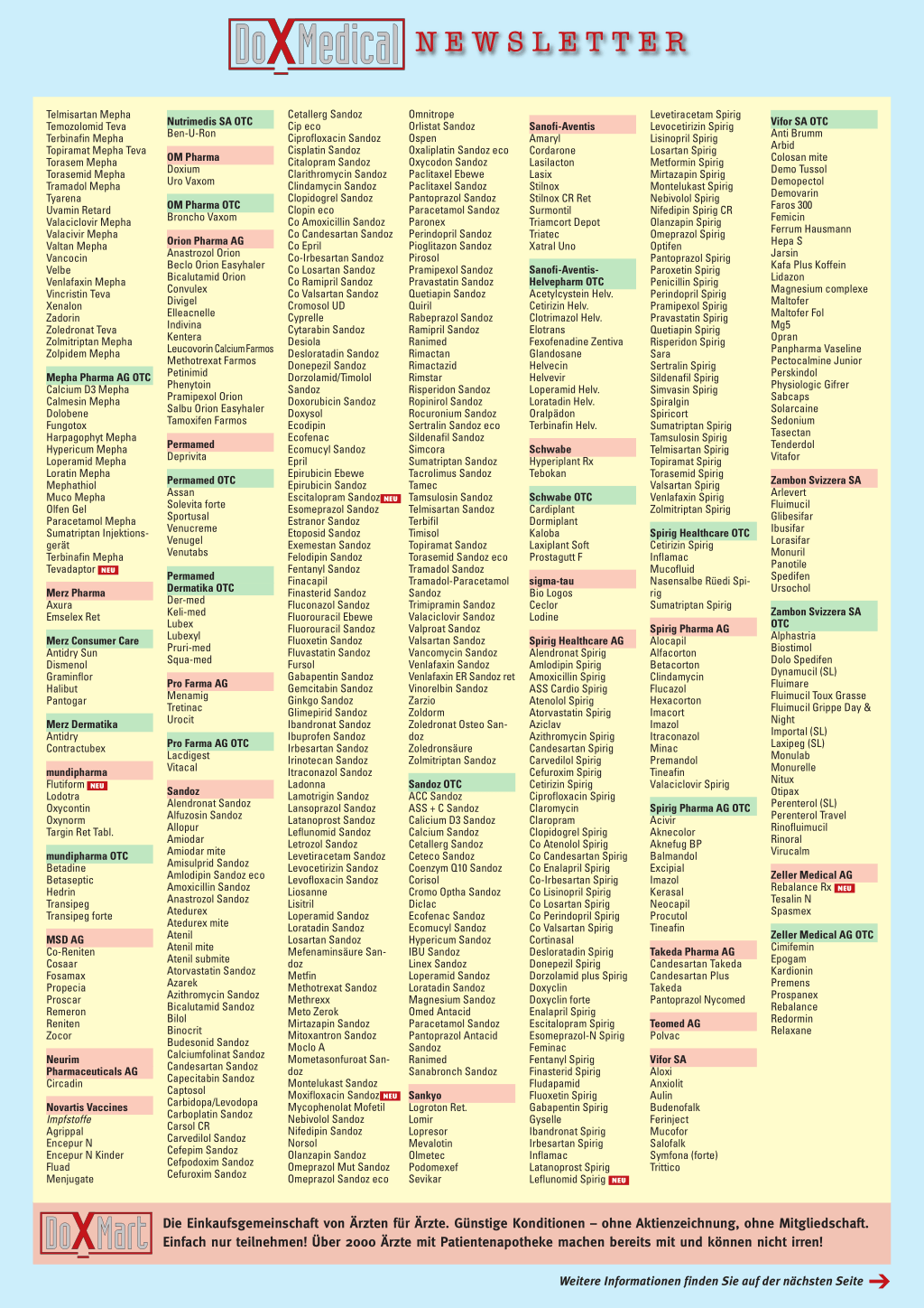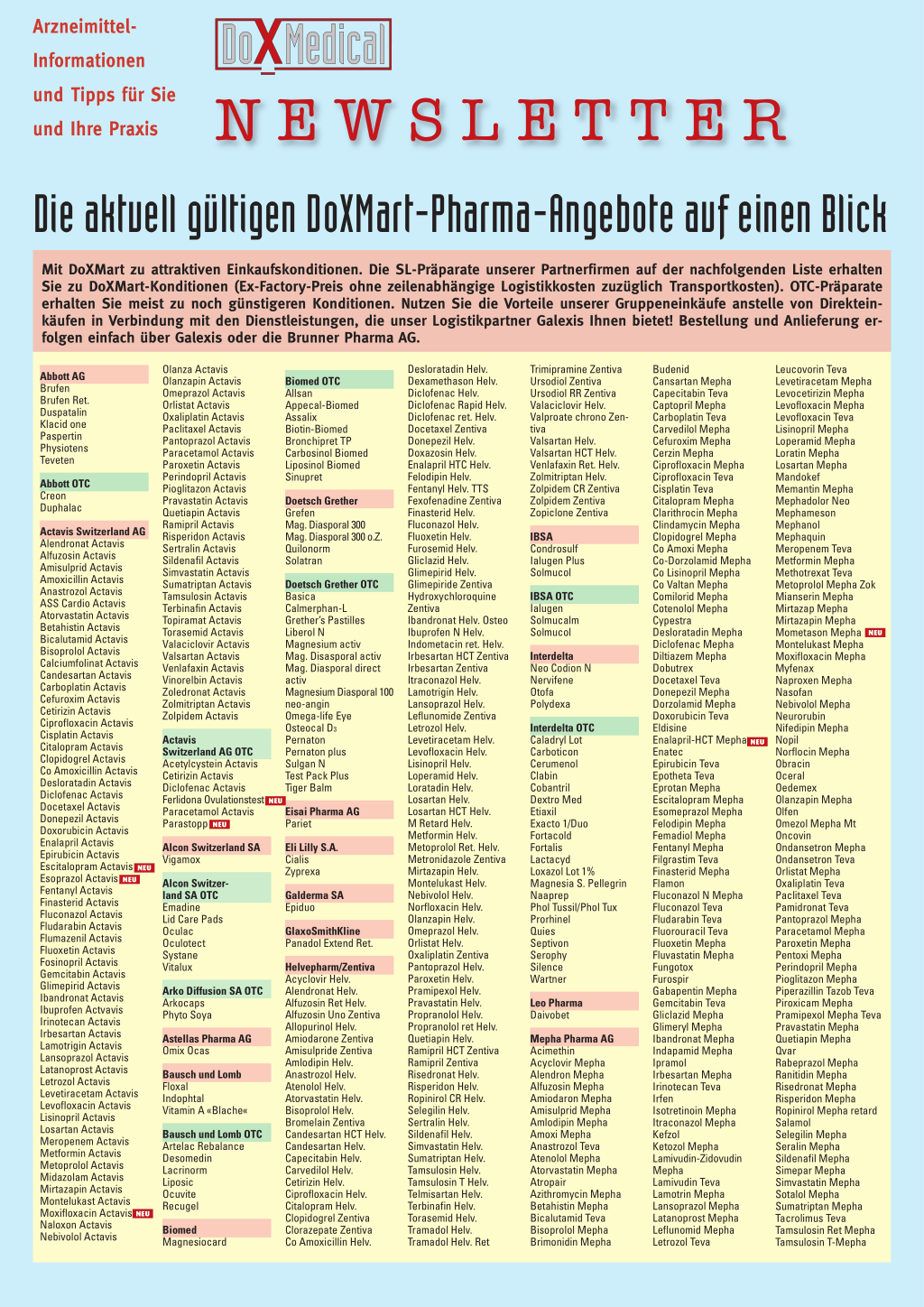 Mit DoXMart zu attraktiven Einkaufskonditionen. Die SL-Präparate unserer Partnerfirmen auf der nachfolgenden Liste erhalten Sie zu DoXMart-Konditionen (Ex-Factory-Preis ohne zeilenabhängige Logistikkosten zuzüglich Transportkosten). OTC-Präparate erhalten Sie meist zu noch günstigeren Konditionen. Nutzen Sie die Vorteile unserer Gruppeneinkäufe anstelle von Direkteinkäufen in Verbindung mit den Dienstleistungen, die unser Logistikpartner Galexis Ihnen bietet! Bestellung und Anlieferung erfolgen einfach über Galexis oder die Brunner Pharma AG.