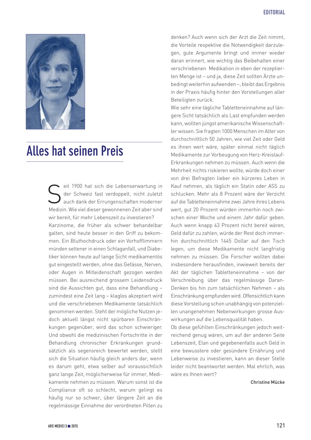 denken? Auch wenn sich der Arzt die Zeit nimmt, die Vorteile respektive die Notwendigkeit darzulegen, gute Argumente bringt und immer wieder daran erinnert, wie wichtig das Beibehalten einer verschriebenen Medikation in eben der rezeptierten Menge ist – und ja, diese Zeit sollten Ärzte unbedingt weiterhin aufwenden –, bleibt das Ergebnis in der Praxis häufig hinter den Vorstellungen aller Beteiligten zurück. Wie sehr eine tägliche Tabletteneinnahme auf längere Sicht tatsächlich als Last empfunden werden kann, wollten jüngst amerikanische Wissenschaftler wissen. Sie fragten 1000 Menschen im Alter von durchschnittlich 50 Jahren, wie viel Zeit oder Geld es ihnen wert wäre, später einmal nicht täglich Medikamente zur Vorbeugung von Herz-KreislaufErkrankungen nehmen zu müssen. Auch wenn die Mehrheit nichts riskieren wollte, würde doch einer von drei Befragten lieber ein kürzeres Leben in Kauf nehmen, als täglich ein Statin oder ASS zu schlucken. Mehr als 8 Prozent wäre der Verzicht auf die Tabletteneinnahme zwei Jahre ihres Lebens wert, gut 20 Prozent würden immerhin noch zwischen einer Woche und einem Jahr dafür geben. Auch wenn knapp 43 Prozent nicht bereit wären, Geld dafür zu zahlen, würde der Rest doch immerhin durchschnittlich 1445 Dollar auf den Tisch legen, um diese Medikamente nicht langfristig nehmen zu müssen. Die Forscher wollten dabei insbesondere herausfinden, inwieweit bereits der Akt der täglichen Tabletteneinnahme – von der Verschreibung über das regelmässige DaranDenken bis hin zum tatsächlichen Nehmen – als Einschränkung empfunden wird. Offensichtlich kann diese Vorstellung schon unabhängig von potenziellen unangenehmen Nebenwirkungen grosse Auswirkungen auf die Lebensqualität haben. Ob diese gefühlten Einschränkungen jedoch weitreichend genug wären, um auf der anderen Seite Lebenszeit, Elan und gegebenenfalls auch Geld in eine bewusstere oder gesündere Ernährung und Lebenweise zu investieren, kann an dieser Stelle leider nicht beantwortet werden. Mal ehrlich, was wäre es Ihnen wert?