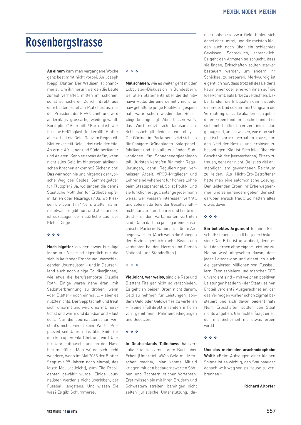 nach haben sie zwar Geld, fühlen sich dabei aber unfrei, und die meisten klagen auch noch über ein schlechtes Gewissen. Schrecklich, schrecklich. Es geht den Ärmsten so schlecht, dass sie finden, Erbschaften sollten stärker besteuert werden, um andern ihr Schicksal zu ersparen. Merkwürdig ist eigentlich nur, dass trotz all des Leidens kaum einer oder eine von ihnen auf die Idee kommt, aufs Erbe zu verzichten. Dabei fänden die Erbqualen damit subito ein Ende. Und so dämmert langsam die Vermutung, dass die akademisch gebildeten Erben (und um solche handelt es sich mehrheitlich) in erster Linie schlau genug sind, um zu wissen, wie man sich politisch korrekt verhalten muss, um den Neid der Besitz- und Erblosen zu besänftigen. Klar ist: Sich frivol über ein Geschenk der (verstorbenen) Eltern zu freuen, geht gar nicht. Da ist es viel anständiger, am gewonnenen Reichtum zu leiden. Als Nicht-Erb-Betroffener hätte man eine salomonische Lösung: Den leidenden Erben ihr Erbe wegnehmen und es jemandem geben, der sich darüber ehrlich freut. So hätten alles etwas davon.