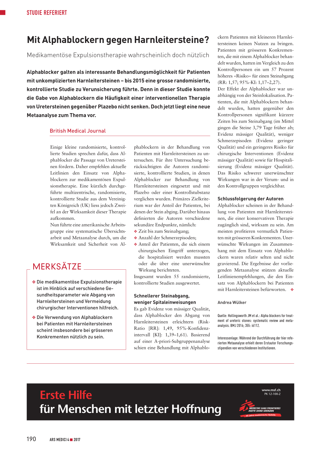 Schlussfolgerung der Autoren Alphablocker scheinen in der Behandlung von Patienten mit Harnleitersteinen, die einer konservativen Therapie zugänglich sind, wirksam zu sein. Am meisten profitieren vermutlich Patienten mit grösseren Konkrementen. Unerwünschte Wirkungen im Zusammenhang mit dem Einsatz von Alphablockern waren relativ selten und nicht gravierend. Die Ergebnisse der vorliegenden Metaanalyse stützen aktuelle Leitlinienempfehlungen, die den Einsatz von Alphablockern bei Patienten mit Harnleitersteinen befürworten. O