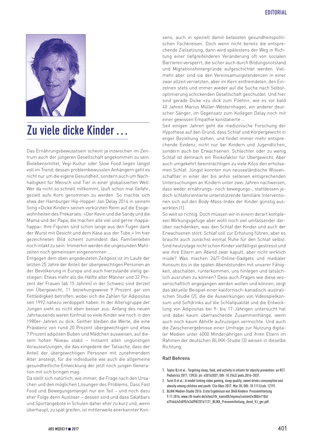 sens, auch in speziell damit befassten gesundheitspolitischen Fachkreisen. Doch wenn nicht bereits die entsprechende Zielsetzung, dann wird spätestens der Weg in Richtung einer tiefgreifenderen Veränderung oft von sozialen Barrieren versperrt, die sicher auch durch Bildungsnotstand und Migrationshintergründe aufgeschichtet werden. Vielmehr aber sind sie den Vereinsamungstendenzen in einer zwar allzeit vernetzten, aber im Kern entfremdeten, den Einzelnen stets und immer wieder auf die Suche nach Selbstoptimierung schickenden Gesellschaft geschuldet. Und hier sind gerade Dicke «zu dick zum Fliehn», wie es vor bald 40 Jahren Marius Müller-Westernhagen, ein anderer deutscher Sänger, im Gegensatz zum Kollegen Delay noch mit einer gewissen Empathie konstatierte … Seit einigen Jahren geht die medizinische Forschung der Hypothese auf den Grund, dass Schlaf und Körpergewicht in enger Beziehung stehen, und findet immer mehr entsprechende Evidenz, nicht nur bei Kindern und Jugendlichen, sondern auch bei Erwachsenen. Schlechter oder zu wenig Schlaf ist demnach ein Risikofaktor für Übergewicht. Aber auch umgekehrt beeinträchtigen zu viele Kilos den erholsamen Schlaf. Jüngst konnten nun neuseeländische Wissenschaftler in einer der bis anhin seltenen entsprechenden Untersuchungen an Kindern unter zwei Jahren nachweisen, dass weder ernährungs- noch bewegungs-, stattdessen jedoch schlaforientierte unterstützende familiäre Interventionen sich auf den Body-Mass-Index der Kinder günstig auswirkten (1). So weit so richtig. Doch müssen wir in einem derart komplexen Wirkungsgefüge aber wohl noch viel umfassender darüber nachdenken, was den Schlaf der Kinder und auch der Erwachsenen stört. Schlaf soll zur Erholung führen, aber es braucht auch zunächst einmal Ruhe für den Schlaf selbst. Sind heutzutage nicht schon Kinder vielfältigst gestresst und wie ihre Eltern am Abend zwar kaputt, aber nicht wirklich müde? Was machen 24/7-Online-Gadgets und medialer Konsum bis in die späten Abendstunden mit unserer Fähigkeit, abschalten, runterkommen, uns hinlegen und tatsächlich ausruhen zu können? Dass auch Fragen wie diese wissenschaftlich angegangen werden wollen und können, zeigt das aktuelle Beispiel einer kalifornisch-kanadisch-australischen Studie (2), die die Auswirkungen von Videospielkonsum und Softdrinks auf die Schlafqualität und die Entwicklung von Adipositas bei 9- bis 17-Jährigen untersucht hat und dabei kaum überraschende Zusammenhänge, wenn auch noch kaum Abhilfe aufzuzeigen vermochte. Und auch die Zwischenergebnisse einer Umfrage zur Nutzung digitaler Medien unter 6000 Minderjährigen und ihren Eltern im Rahmen der deutschen BLIKK-Studie (3) weisen in dieselbe Richtung.