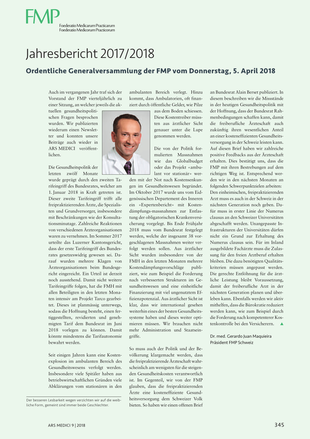 an Bundesrat Alain Berset publiziert. In diesem beschreiben wir die Missstände in der heutigen Gesundheitspolitik mit der Hoffnung, dass der Bundesrat Rahmenbedingungen schaffen kann, damit die freiberufliche Ärzteschaft auch zukünftig ihren wesentlichen Anteil an einer kosteneffizienten Gesundheitsversorgung in der Schweiz leisten kann. Auf diesen Brief haben wir zahlreiche positive Feedbacks aus der Ärzteschaft erhalten. Dies bestätigt uns, dass die FMP mit ihren Bestrebungen auf dem richtigen Weg ist. Entsprechend werden wir in den nächsten Monaten an folgenden Schwerpunktzielen arbeiten: Den einheimischen, freipraktizierenden Arzt muss es auch in der Schweiz in der nächsten Generation noch geben. Dafür muss in erster Linie der Numerus clausus an den Schweizer Universitäten abgeschafft werden. Unangepasste Infrastrukturen der Universitäten dürfen nicht ein Grund zur Erhaltung des Numerus clausus sein. Für im Inland ausgebildete Fachärzte muss die Zulassung für den freien Arztberuf erhalten bleiben. Die dazu benötigten Qualitätskriterien müssen angepasst werden. Die gerechte Entlöhnung für die ärztliche Leistung bleibt Voraussetzung, damit der freiberufliche Arzt in der nächsten Generation planen und überleben kann. Ebenfalls werden wir aktiv mithelfen, dass die Bürokratie reduziert werden kann, wie zum Beispiel durch die Forderung nach kompetenterer Kostenkontrolle bei den Versicherern. L