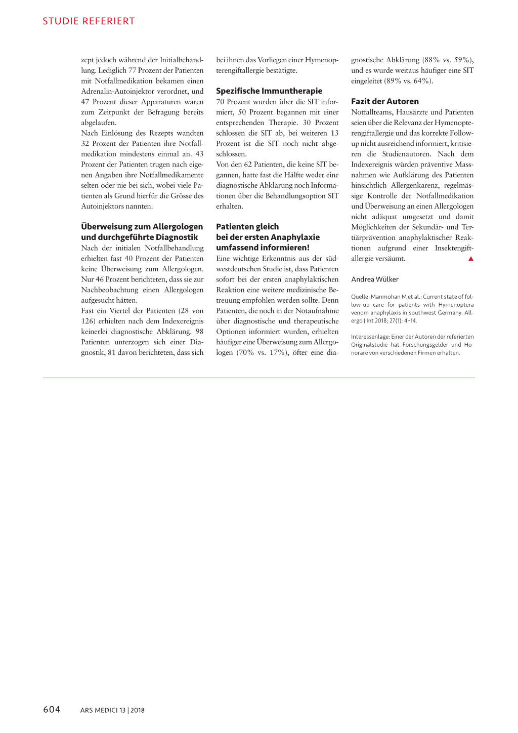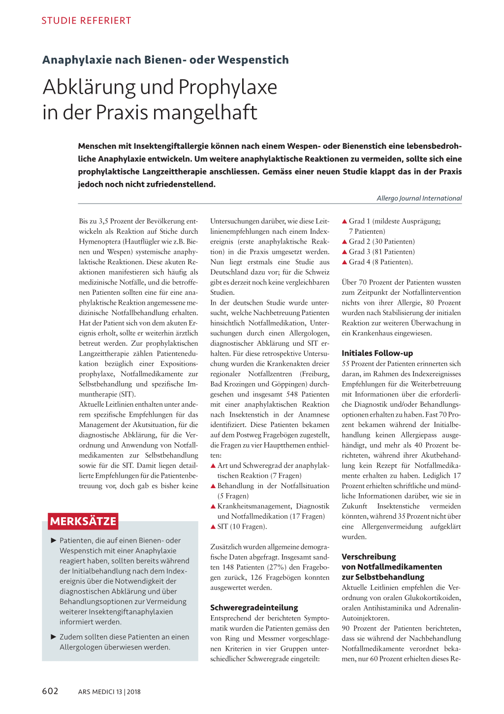 Untersuchungen darüber, wie diese Leitlinienempfehlungen nach einem Indexereignis (erste anaphylaktische Reaktion) in die Praxis umgesetzt werden. Nun liegt erstmals eine Studie aus Deutschland dazu vor; für die Schweiz gibt es derzeit noch keine vergleichbaren Studien. In der deutschen Studie wurde untersucht, welche Nachbetreuung Patienten hinsichtlich Notfallmedikation, Untersuchungen durch einen Allergologen, diagnostischer Abklärung und SIT erhalten. Für diese retrospektive Untersuchung wurden die Krankenakten dreier regionaler Notfallzentren (Freiburg, Bad Krozingen und Göppingen) durchgesehen und insgesamt 548 Patienten mit einer anaphylaktischen Reaktion nach Insektenstich in der Anamnese identifiziert. Diese Patienten bekamen auf dem Postweg Fragebögen zugestellt, die Fragen zu vier Hauptthemen enthielten: L Art und Schweregrad der anaphylak-