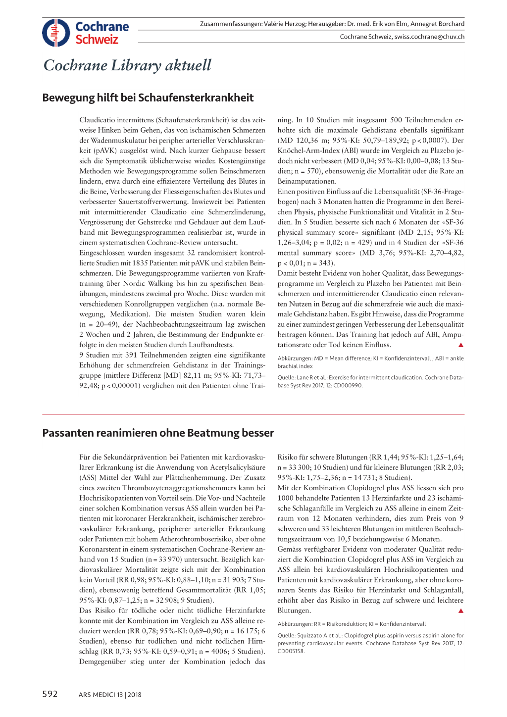 Claudicatio intermittens (Schaufensterkrankheit) ist das zeitweise Hinken beim Gehen, das von ischämischen Schmerzen der Wadenmuskulatur bei peripher arterieller Verschlusskrankeit (pAVK) ausgelöst wird. Nach kurzer Gehpause bessert sich die Symptomatik üblicherweise wieder. Kostengünstige Methoden wie Bewegungsprogramme sollen Beinschmerzen lindern, etwa durch eine effizientere Verteilung des Blutes in die Beine, Verbesserung der Fliesseigenschaften des Blutes und verbesserter Sauertstoffverwertung. Inwieweit bei Patienten mit intermittierender Claudicatio eine Schmerzlinderung, Vergrösserung der Gehstrecke und Gehdauer auf dem Laufband mit Bewegungsprogrammen realisierbar ist, wurde in einem systematischen Cochrane-Review untersucht. Eingeschlossen wurden insgesamt 32 randomisiert kontrollierte Studien mit 1835 Patienten mit pAVK und stabilen Beinschmerzen. Die Bewegungsprogramme variierten von Krafttraining über Nordic Walking bis hin zu spezifischen Beinübungen, mindestens zweimal pro Woche. Diese wurden mit verschiedenen Konrollgruppen verglichen (u.a. normale Bewegung, Medikation). Die meisten Studien waren klein (n = 20–49), der Nachbeobachtungszeitraum lag zwischen 2 Wochen und 2 Jahren, die Bestimmung der Endpunkte erfolgte in den meisten Studien durch Laufbandtests. 9 Studien mit 391 Teilnehmenden zeigten eine signifikante Erhöhung der schmerzfreien Gehdistanz in der Trainingsgruppe (mittlere Differenz [MD] 82,11 m; 95%-KI: 71,73– 92,48; p < 0,00001) verglichen mit den Patienten ohne Trai- ning. In 10 Studien mit insgesamt 500 Teilnehmenden er- höhte sich die maximale Gehdistanz ebenfalls signifikant (MD 120,36 m; 95%-KI: 50,79–189,92; p < 0,0007). Der Knöchel-Arm-Index (ABI) wurde im Vergleich zu Plazebo je- doch nicht verbessert (MD 0,04; 95%-KI: 0,00–0,08; 13 Stu- dien; n = 570), ebensowenig die Mortalität oder die Rate an Beinamputationen. Einen positiven Einfluss auf die Lebensqualität (SF-36-Frage- bogen) nach 3 Monaten hatten die Programme in den Berei- chen Physis, physische Funktionalität und Vitalität in 2 Stu- dien. In 5 Studien besserte sich nach 6 Monaten der «SF-36 physical summary score» signifikant (MD 2,15; 95%-KI: 1,26–3,04; p = 0,02; n = 429) und in 4 Studien der «SF-36 mental summary score» (MD 3,76; 95%-KI: 2,70–4,82, p < 0,01; n = 343). Damit besteht Evidenz von hoher Qualität, dass Bewegungs- programme im Vergleich zu Plazebo bei Patienten mit Bein- schmerzen und intermittierender Claudicatio einen relevan- ten Nutzen in Bezug auf die schmerzfreie wie auch die maxi- male Gehdistanz haben. Es gibt Hinweise, dass die Programme zu einer zumindest geringen Verbesserung der Lebensqualität beitragen können. Das Training hat jedoch auf ABI, Ampu- tationsrate oder Tod keinen Einfluss. L Abkürzungen: MD = Mean difference; KI = Konfidenzintervall ; ABI = ankle brachial index Quelle: Lane R et al.: Exercise for intermittent claudication. Cochrane Database Syst Rev 2017; 12: CD000990. Passanten reanimieren ohne Beatmung besser Für die Sekundärprävention bei Patienten mit kardiovaskulärer Erkrankung ist die Anwendung von Acetylsalicylsäure (ASS) Mittel der Wahl zur Plättchenhemmung. Der Zusatz eines zweiten Thrombozytenaggregationshemmers kann bei Hochrisikopatienten von Vorteil sein. Die Vor- und Nachteile einer solchen Kombination versus ASS allein wurden bei Patienten mit koronarer Herzkrankheit, ischämischer zerebrovaskulärer Erkrankung, peripherer arterieller Erkrankung oder Patienten mit hohem Atherothromboserisiko, aber ohne Koronarstent in einem systematischen Cochrane-Review anhand von 15 Studien (n = 33 970) untersucht. Bezüglich kardiovaskulärer Mortalität zeigte sich mit der Kombination kein Vorteil (RR 0,98; 95%-KI: 0,88–1,10; n = 31 903; 7 Studien), ebensowenig betreffend Gesamtmortalität (RR 1,05; 95%-KI: 0,87–1,25; n = 32 908; 9 Studien). Das Risiko für tödliche oder nicht tödliche Herzinfarkte konnte mit der Kombination im Vergleich zu ASS alleine reduziert werden (RR 0,78; 95%-KI: 0,69–0,90; n = 16 175; 6 Studien), ebenso für tödlichen und nicht tödlichen Hirnschlag (RR 0,73; 95%-KI: 0,59–0,91; n = 4006; 5 Studien). Demgegenüber stieg unter der Kombination jedoch das Risiko für schwere Blutungen (RR 1,44; 95%-KI: 1,25–1,64; n = 33 300; 10 Studien) und für kleinere Blutungen (RR 2,03; 95%-KI: 1,75–2,36; n = 14 731; 8 Studien). Mit der Kombination Clopidogrel plus ASS liessen sich pro 1000 behandelte Patienten 13 Herzinfarkte und 23 ischämi- sche Schlaganfälle im Vergleich zu ASS alleine in einem Zeit- raum von 12 Monaten verhindern, dies zum Preis von 9 schweren und 33 leichteren Blutungen im mittleren Beobach- tungszeitraum von 10,5 beziehungsweise 6 Monaten. Gemäss verfügbarer Evidenz von moderater Qualität redu- ziert die Kombination Clopidogrel plus ASS im Vergleich zu ASS allein bei kardiovaskulären Hochrisikopatienten und Patienten mit kardiovaskulärer Erkrankung, aber ohne koro- naren Stents das Risiko für Herzinfarkt und Schlaganfall, erhöht aber das Risiko in Bezug auf schwere und leichtere Blutungen. L Abkürzungen: RR = Risikoreduktion; KI = Konfidenzintervall Quelle: Squizzato A et al.: Clopidogrel plus aspirin versus aspirin alone for preventing cardiovascular events. Cochrane Database Syst Rev 2017; 12: CD005158. 592 ARS MEDICI 13 | 2018 Zusammenfassungen: Valérie Herzog; Herausgeber: Dr. med. Erik von Elm Cochrane Schweiz, swiss.cochrane@chuv.ch Neues aus der Cochrane Library Probiotika in der Prävention von Clostridium-difficile-Diarrhö hilfreich Antibiotika können die Darmmikrobiota dahingehend stören, dass die Widerstandsfähigkeit gegen Clostridium difficile reduziert sein kann. Probiotika als Präparate mit lebenden Mikroorganismen können für den Wirt gesundheitsfördernd sein. Inwieweit sich Probiotika zur Prävention einer durch Clostridium difficile bedingten Diarrhö (CDAD) bei Kindern und Erwachsenen eignen, die sich einer Antibiotikatherapie un