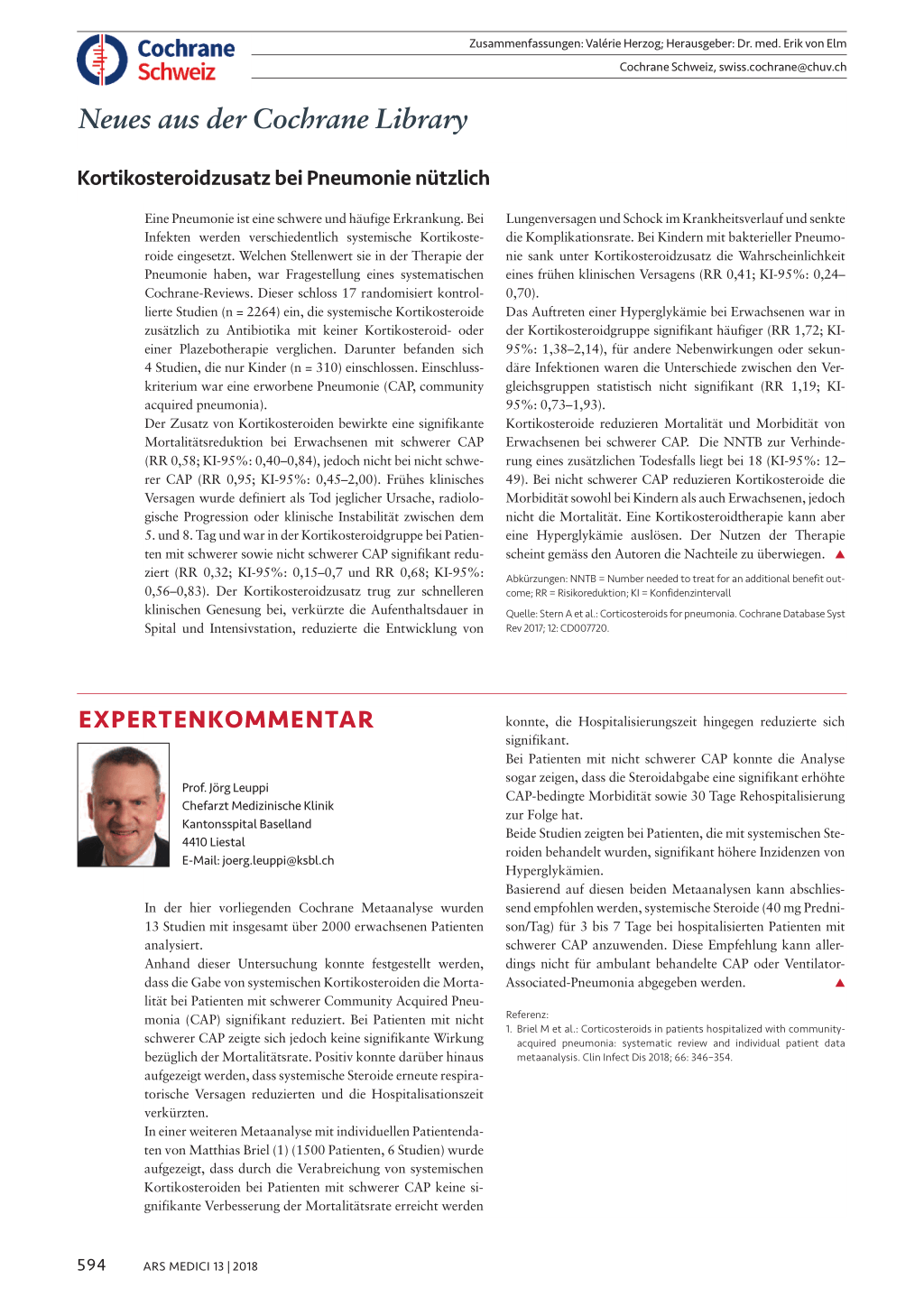 In der hier vorliegenden Cochrane Metaanalyse wurden 13 Studien mit insgesamt über 2000 erwachsenen Patienten analysiert. Anhand dieser Untersuchung konnte festgestellt werden, dass die Gabe von systemischen Kortikosteroiden die Mortalität bei Patienten mit schwerer Community Acquired Pneumonia (CAP) signifikant reduziert. Bei Patienten mit nicht schwerer CAP zeigte sich jedoch keine signifikante Wirkung bezüglich der Mortalitätsrate. Positiv konnte darüber hinaus aufgezeigt werden, dass systemische Steroide erneute respiratorische Versagen reduzierten und die Hospitalisationszeit verkürzten. In einer weiteren Metaanalyse mit individuellen Patientendaten von Matthias Briel (1) (1500 Patienten, 6 Studien) wurde aufgezeigt, dass durch die Verabreichung von systemischen Kortikosteroiden bei Patienten mit schwerer CAP keine signifikante Verbesserung der Mortalitätsrate erreicht werden