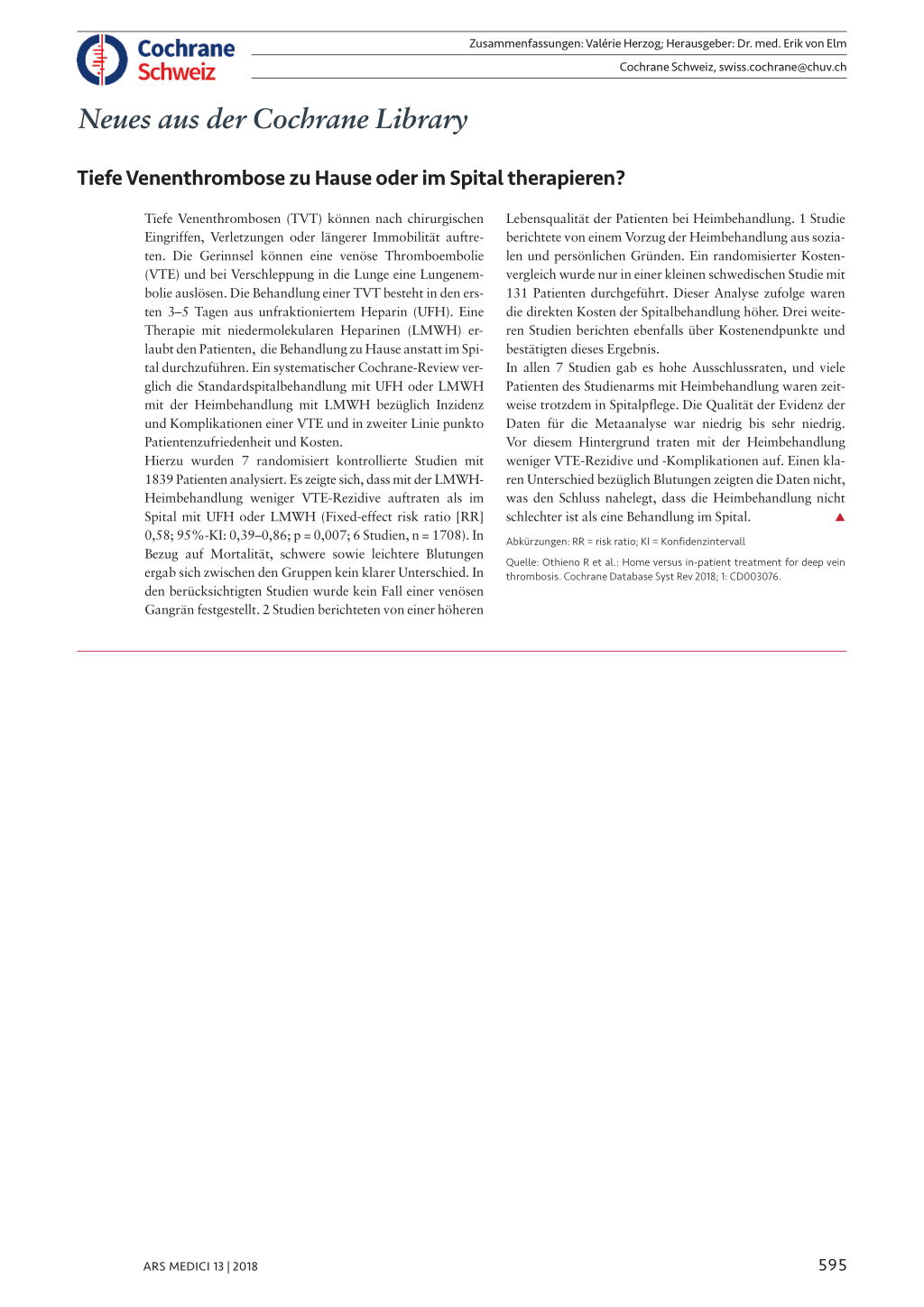 Tiefe Venenthrombosen (TVT) können nach chirurgischen Eingriffen, Verletzungen oder längerer Immobilität auftreten. Die Gerinnsel können eine venöse Thromboembolie (VTE) und bei Verschleppung in die Lunge eine Lungenembolie auslösen. Die Behandlung einer TVT besteht in den ersten 3–5 Tagen aus unfraktioniertem Heparin (UFH). Eine Therapie mit niedermolekularen Heparinen (LMWH) erlaubt den Patienten, die Behandlung zu Hause anstatt im Spital durchzuführen. Ein systematischer Cochrane-Review verglich die Standardspitalbehandlung mit UFH oder LMWH mit der Heimbehandlung mit LMWH bezüglich Inzidenz und Komplikationen einer VTE und in zweiter Linie punkto Patientenzufriedenheit und Kosten. Hierzu wurden 7 randomisiert kontrollierte Studien mit 1839 Patienten analysiert. Es zeigte sich, dass mit der LMWHHeimbehandlung weniger VTE-Rezidive auftraten als im Spital mit UFH oder LMWH (Fixed-effect risk ratio [RR] 0,58; 95%-KI: 0,39–0,86; p = 0,007; 6 Studien, n = 1708). In Bezug auf Mortalität, schwere sowie leichtere Blutungen ergab sich zwischen den Gruppen kein klarer Unterschied. In den berücksichtigten Studien wurde kein Fall einer venösen Gangrän festgestellt. 2 Studien berichteten von einer höheren