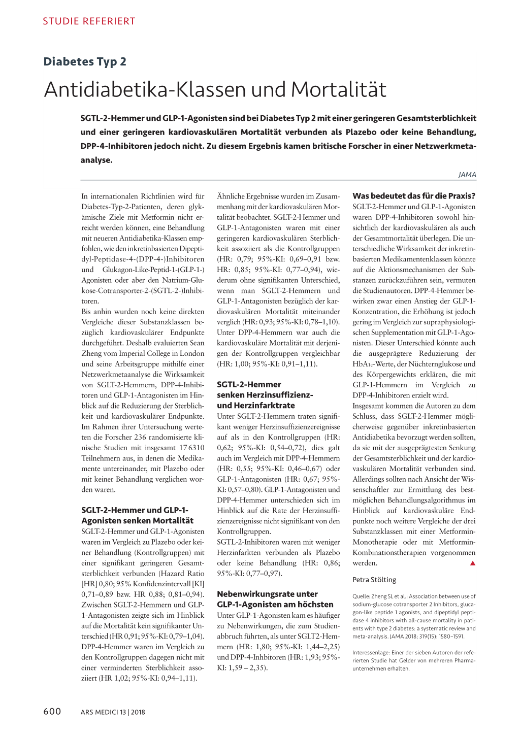 Quelle: Zheng SL et al.: Association between use of sodium-glucose cotransporter 2 Inhibitors, glucagon-like peptide 1 agonists, and dipeptidyl peptidase 4 inhibitors with all-cause mortality in patients with type 2 diabetes: a systematic review and meta-analysis. JAMA 2018; 319(15): 1580–1591.