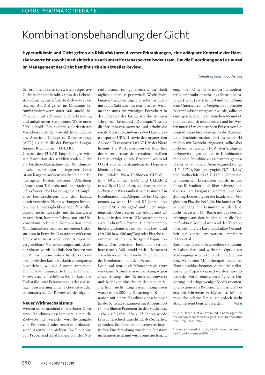 renfunktion, erfolgt ebenfalls mehrfach täglich und muss potenzielle Wechselwirkungen berücksichtigen. Insofern ist Lesinurad als Substanz mit einem neuen Wirkmechanismus ein wichtiger Fortschritt in der Therapie der Gicht, wie die Autoren schreiben. Lesinurad (Zurampic®) senkt die Serumharnsäurewerte und erhöht die renale Clearance, indem es den Harnsäuretransporter URAT1 sowie den organischen Anionen-Transporter 4 (OAT4) in der Niere hemmt. Die Rückresorption der Mehrheit der Harnsäure aus dem renalen tubulären Lumen erfolgt durch Ersteren, während OAT4 eine diuretikainduzierte Hyperurikämie auslöst. Die initialen Phase-III-Studien CLEAR 1 (n = 601, in den USA) und CLEAR 2 (n = 610; in 12 Ländern, u.a. Europa) untersuchten die Wirksamkeit von Lesinurad in Kombination mit Allopurinol bei Gichtpatienten zwischen 18 und 85 Jahren, mit einem BMI < 45 kg/m2 und einem ungenügenden Ansprechen auf Allopurinol allein, die in den letzten 12 Monaten mehr als zwei Gichtanfälle hatten. Die Patienten erhielten randomisiert ein Jahr lang Lesinurad (1 x 200 bzw. 400 mg/Tag) oder Plazebo zusammen mit ihrer vorherigen Allopurinoldosis. Den primären Endpunkt (Serumharnsäure < 360 μmol/l nach 6 Monaten) erreichten signifikant mehr Patienten unter der Kombination mit dem Verum. Lesinurad wurde als Monotherapie trotz wirksamer Serumharnsäuresenkung wegen eines Anstiegs der Serumkreatininwerte und Bedenken hinsichtlich der renalen Sicherheit nicht zugelassen. Zugelassen wurde es als 200-mg-Dosierung in Kombination mit einem Xanthinoxidasehemmer (in der Schweiz zusammen mit Allopurinol) (1). Bei älteren Patienten (in den Studien ca. 13% ≥ 65 Jahre, 2% ≥ 75 Jahre) wurde kein Unterschied hinsichtlich der Sicherheit gefunden. Bei Patienten mit schwerer hepatischer Einschränkung wurde die Substanz nicht untersucht und wird somit auch nicht empfohlen. Obwohl bei milder bis modera- ter Nierenfunktionsstörung (Kreatininclea- rance [CrCL] zwischen 30 und 90 ml/min) kein Unterschied im Vergleich zu normaler Nierenfunktion festgestellt wurde, sollte bei einer geschätzten CrCl zwischen 45 und 60 ml/min dennoch monitorisiert und bei Wer- ten unter 45 ml/min auf den Einsatz von Le- sinurad verzichtet werden, so die Autoren. Laut Fachinformation darf es unter 45 ml/min mit Vorsicht eingesetzt, sollte aber nicht initiiert werden (1). Zu den häufigsten Nebenwirkungen zählten in Kombination mit einem Xanthinoxidasehemmer gemäss Haber et al. obere Atemwegsinfektionen (1,5– 15%), Nasopharyngitis (3,7–13,8%) und Bluthochdruck (5,7–11%). Neben nie- renbezogenen Ereignissen wurde in den Phase-III-Studien auch über schwere kar- diovaskuläre Ereignisse berichtet, unter der 200-mg-Dosierung lag die Inzidenz im Ver- gleich zu Plazebo bei 1,36. Ein kausaler Zu- sammenhang mit Lesinurad wurde dabei nicht hergestellt (1). Basierend auf den Er- fahrungen aus den Studien sollte die Nie- renfunktion vor und während der Therapie überprüft und die kardiovaskuläre Gesund- heit gut kontrolliert werden, empfehlen Haber et al. Zusammenfassend beschreiben sie Lesinu- rad als sichere und wirksame Option zur Vorbeugung wiederkehrender Gichtepiso- den, wenn eine Monotherapie mit einem Xanthinoxidasehemmer durch ein uriko- surisches Präparat ergänzt werden muss. Es habe den Vorteil einer einmal täglichen Do- sierung und bringe weniger Medikamenten- interaktionen als Probenecid mit sich. Da es erst seit Kürzerem verfügbar ist, können mögliche seltene Ereignisse jedoch nicht abschliessend beurteilt werden. Mü L Quelle: Haber SL et al.: Lesinurad: a novel agent for the management of chronic gout. Ann Pharmacother 2018; 52(7): 690–696. 1. www.swissmedicinfo.ch, Fachinformation Lesinurad, Stand November 2016. 590 ARS MEDICI 13 | 2018