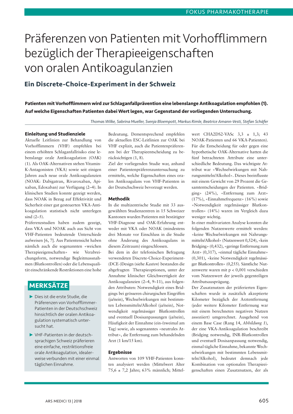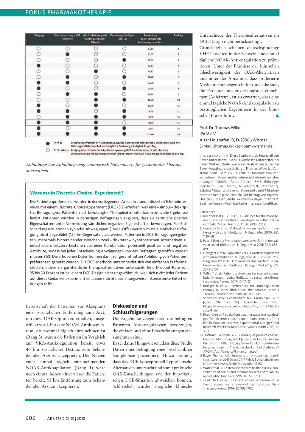 wert CHA2DS2-VASc 3,3 ± 1,3; 43 NOAK-Patienten und 66 VKA-Patienten). Für die Entscheidung für oder gegen eine hypothetische OAK-Alternative hatten die fünf betrachteten Attribute eine unterschiedliche Bedeutung. Das wichtigste Attribut war «Wechselwirkungen mit Nahrungsmitteln/Alkohol». Dieses beeinflusste mit einem Gewicht von 29 Prozent die Gesamtentscheidungen der Patienten. «Bridging» (24%), «Entfernung zum Arzt» (17%), «Einnahmefrequenz» (16%) sowie «Notwendigkeit regelmässiger Blutkontrollen» (14%) waren im Vergleich dazu weniger wichtig. In einer multivariaten Analyse konnten die folgenden Nutzenwerte ermittelt werden: «keine Wechselwirkungen mit Nahrungsmitteln/Alkohol» (Nutzenwert 0,524), «kein Bridging» (0,432), «geringe Entfernung zum Arzt» (0,317), «einmal tägliche Einnahme» (0,301), «keine Notwendigkeit regelmässiger Blutkontrollen» (0,255). Sämtliche Nutzenwerte waren mit p < 0,001 verschieden vom Nutzenwert der jeweils gegenteiligen Attributsausprägung. Der Zusatznutzen der präferierten Eigenschaften wurde in zusätzlich akzeptierte Kilometer bezüglich der Arztentfernung (jeder weitere Kilometer Entfernung war mit einem berechneten negativen Nutzen assoziiert) umgerechnet. Ausgehend von einem Base Case (Rang 14, Abbildung 1), der eine VKA-Antikoagulation beschreibt (Bridging notwendig, INR-Blutkontrollen und eventuell Dosisanpassung notwendig, einmal tägliche Einnahme, bekannte Wechselwirkungen mit bestimmten Lebensmitteln/Alkohol), bedeutet demnach jede Kombination von optionalen Therapieeigenschaften einen Zusatznutzen, der als ARS MEDICI 13 | 2018 605 FOKUS PHARMAKOTHERAPIE Unterschiede der Therapiealternativen im DCE-Design nicht berücksichtigt. Grundsätzlich scheinen deutschsprachige VHF-Patienten in der Schweiz eine einmal tägliche NOAK-Antikoagulation zu präfe- rieren. Unter der Prämisse der klinischen Gleichwertigkeit der OAK-Alternativen und unter der Annahme, dass präferierte Medikamenteneigenschaften auch die sind, die Patienten am zuverlässigsten einneh- men (Adhärenz), ist zu erwarten, dass eine einmal tägliche NOAK-Antikoagulation zu bestmöglichen Ergebnissen in der klini- schen Praxis führt. L Abbildung: Die Abbildung zeigt summarisch Nutzenwerte für gesamthafte Therapiealternativen. Warum ein Discrete-Choice-Experiment? Die Patientenpräferenzen wurden in der vorliegenden Arbeit in standardisierten Telefoninterviews mit einem Discrete-Choice-Experiment (DCE) (12) erhoben, weil eine «simple» deskriptive Befragung von Patienten nach bevorzugtenTherapieattributen kaum sinnvolle Ergebnisse liefert. Patienten würden in derartigen Befragungen angeben, dass sie sämtliche positive Eigenschaften unter Vermeidung sämtlicher negativer Eigenschaften bevorzugen. Für Entscheidungssituationen typische Abwägungen (Trade-Offs) werden mittels einfacher Befragung nicht abgebildet (12). Im Gegensatz dazu werden Patienten in DCE-Befragungen gebeten, mehrmals hintereinander zwischen zwei «diskreten» hypothetischen Alternativen zu entscheiden; Letztere bestehen aus einer Kombination potenziell positiver und negativer Attribute, sodass bei jeder Entscheidung Abwägungen von den Befragten getroffen werden müssen (13). Die erhobenen Daten können dann zur gesamthaften Abbildung von Patientenpräferenzen genutzt werden. Die DCE-Methode unterscheidet sich von einfachen Präferenzstudien, indem sie ganzheitliche Therapiealternativen untersucht. Eine Dropout-Rate von 25 bis 30 Prozent ist bei einem DCE-Design nicht ungewöhnlich, weil sich nicht jeder Patient auf dieses Gedankenexperiment einlassen möchte beziehungsweise inkonsistente Entscheidungen trifft. Bereitschaft der Patienten zur Akzeptanz einer zusätzlichen Entfernung zum Arzt, um diese OAK-Option zu erhalten, ausgedrückt wird. Für eine NOAK-Antikoagulation, die zweimal täglich einzunehmen ist (Rang 3), wären die Patienten im Vergleich zur VKA-Antikoagulation bereit, etwa 40 km zusätzlicher Distanz zum behandelnden Arzt zu akzeptieren. Der Nutzen einer einmal täglich einzunehmenden NOAK-Antikoagulation (Rang 1) wäre noch einmal höher – hier wären die Patienten bereit, 53 km Entfernung zum behandelnden Arzt zu akzeptieren. Diskussion und Schlussfolgerungen Die Ergebnisse zeigen, dass die befragten Patienten Antikoagulanzien bevorzugen, die einfach und ohne Einschränkungen einzunehmen sind. Es sei darauf hingewiesen, dass diese Studie Daten einer Befragung einer beschränkten Sample-Size präsentiert. Hinzu kommt, dass das DCE konzeptionell hypothetische Alternativen untersucht und somit praktische OAK-Entscheidungen von der hypothetischen DCE-Situation abweichen können. Schliesslich wurden mögliche klinische Prof. Dr. Thomas Wilke IPAM e.V. Alter Holzhafen 19, D-23966 Wismar E-Mail: thomas.wilke@ipam-wismar.de Interessenskonflikt: Diese Studie wurde finanziell von Bayer unterstützt. Markus Rimle ist Mitarbeiter bei Bayer. Stefan Schäfer war bis 2014 als Angestellter bei Bayer Healthcare beschäftigt. Thomas Wilke ist Vorstand beim IPAM e.V. Er erhielt Honorare von verschiedenen Pharmaunternehmen/Unternehmensberatungen (AbbVie, Astra Zeneca, BMS, Böhringer Ingelheim, GSK, Merck, NovoNordisk, Pharmerit). Sabrina Müller und Svenja Bloempott sind Mitarbeiterinnen bei Ingress-Health; Der Beitrag von IngressHealth zu dieser Studie wurde von Bayer finanziert. Beatrice Amann-Vesti hat keine Interessenkonflikte. Referenzen: 1. Kirchhof P et al.: 2016 ESC Guidelines for the manage- ment of atrial fibrillation developed in collaboration with EACTS. Eur Heart J 2016; 37: 2893–2962. 2. Connolly SJ et al.: Dabigatran versus warfarin in patients with atrial fibrillation. N Engl J Med 2009; 361: 1139–1151. 3. Patel MR et al.: Rivaroxaban versus warfarin in nonvalvular atrial fibrillation. N Engl J Med 2011; 365: 883– 891. 4. Granger CB et al.: Apixaban versus warfarin in patients with atrial fibrillation. N Engl J Med 2011; 365: 981–992. 5. Giugliano RP et al.: E