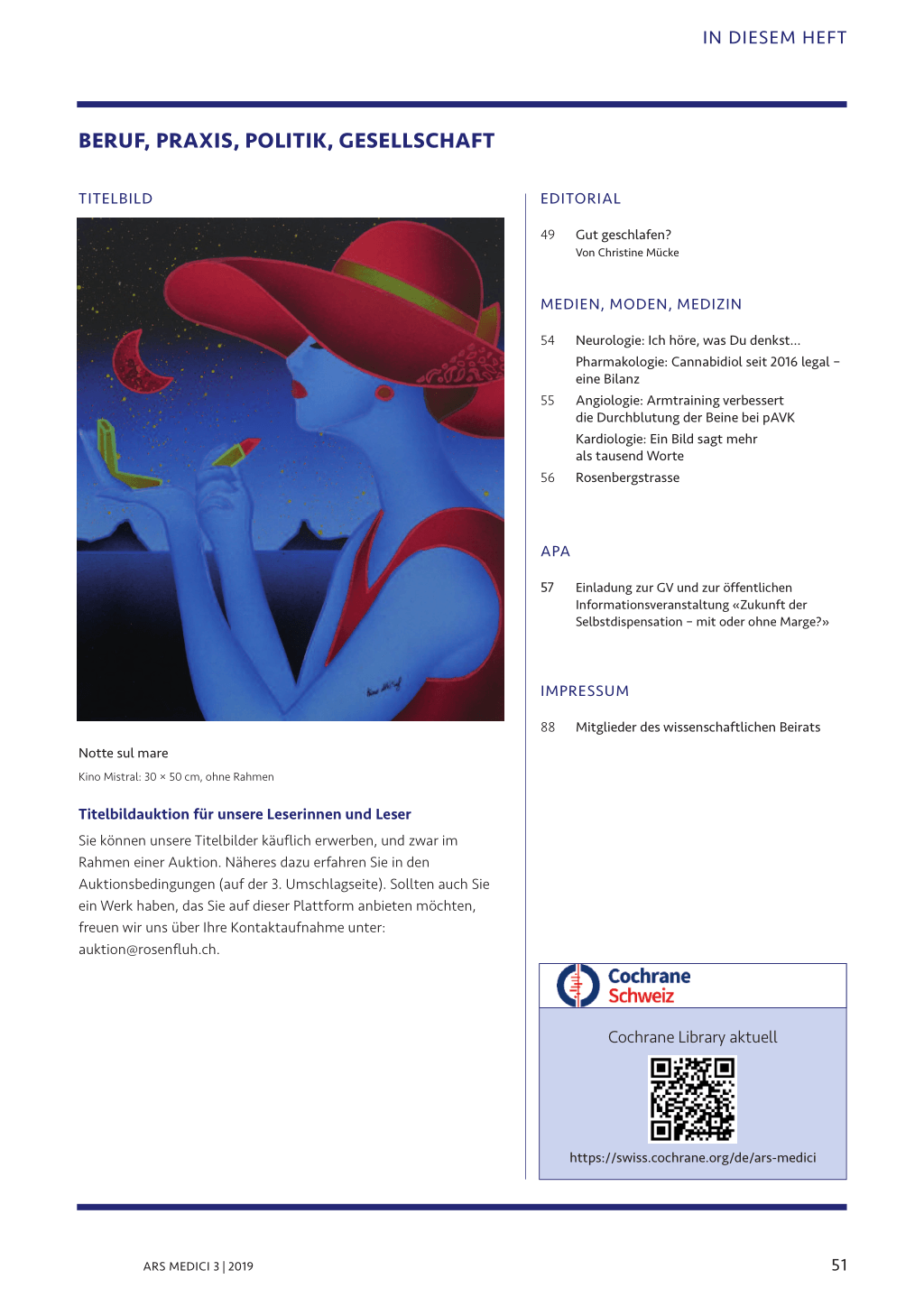 Titelbildauktion für unsere Leserinnen und Leser Sie können unsere Titelbilder käuflich erwerben, und zwar im Rahmen einer Auktion. Näheres dazu erfahren Sie in den Auktionsbedingungen (auf der 3. Umschlagseite). Sollten auch Sie ein Werk haben, das Sie auf dieser Plattform anbieten möchten, freuen wir uns über Ihre Kontaktaufnahme unter: auktion@rosenfluh.ch.