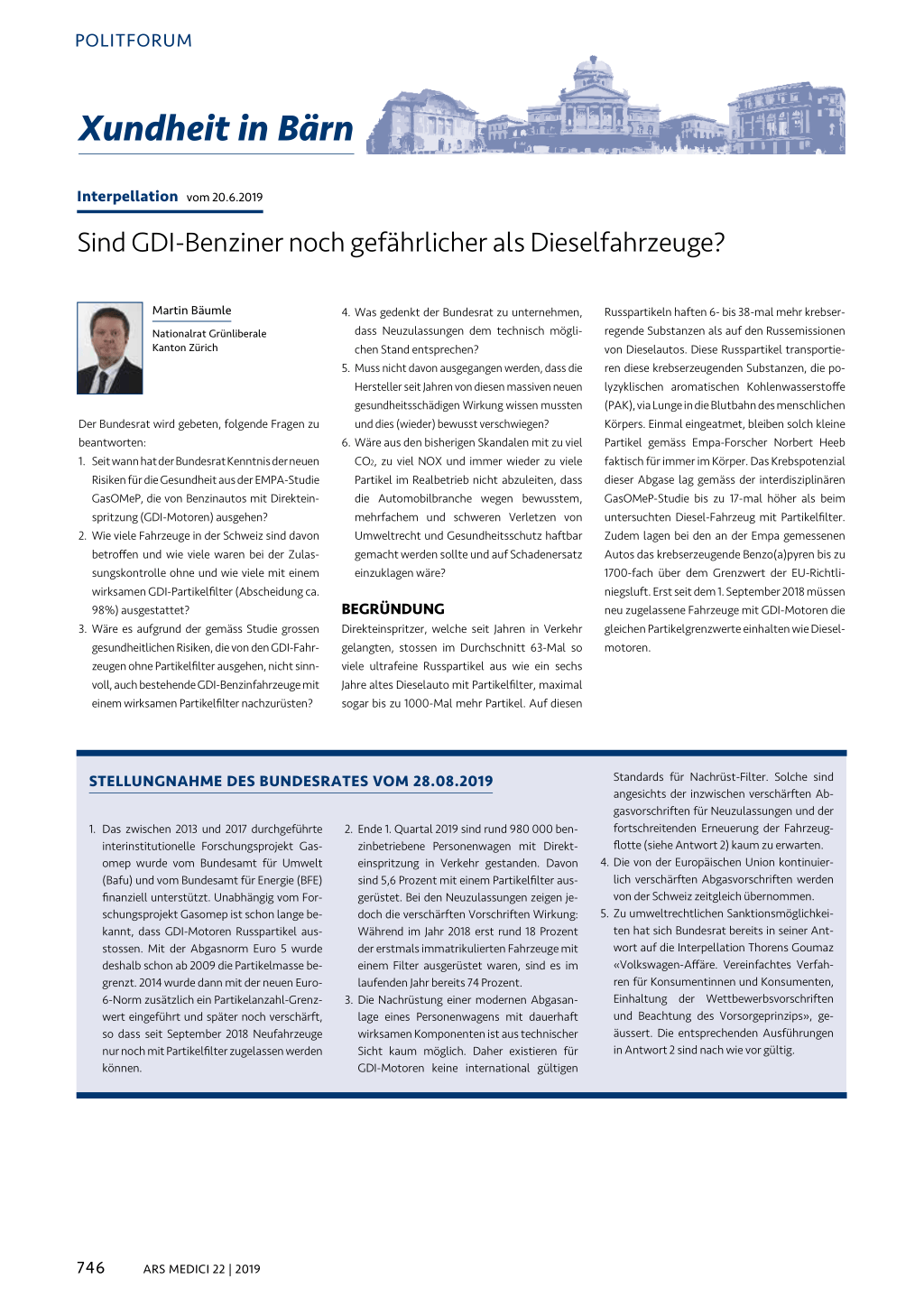 Risiken für die Gesundheit aus der EMPA-Studie GasOMeP, die von Benzinautos mit Direkteinspritzung (GDI-Motoren) ausgehen? 2. Wie viele Fahrzeuge in der Schweiz sind davon betroffen und wie viele waren bei der Zulassungskontrolle ohne und wie viele mit einem wirksamen GDI-Partikelfilter (Abscheidung ca. 98%) ausgestattet? 3. Wäre es aufgrund der gemäss Studie grossen gesundheitlichen Risiken, die von den GDI-Fahrzeugen ohne Partikelfilter ausgehen, nicht sinnvoll, auch bestehende GDI-Benzinfahrzeuge mit einem wirksamen Partikelfilter nachzurüsten?