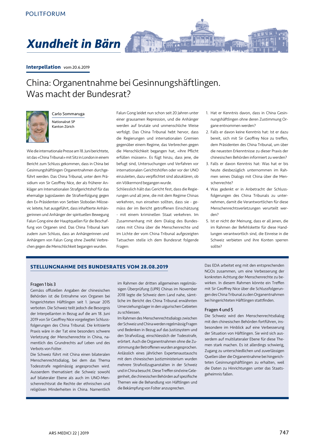 Gemäss offiziellen Angaben der chinesischen Behörden ist die Entnahme von Organen bei hingerichteten Häftlingen seit 1. Januar 2015 verboten. Die Schweiz teilt jedoch die Besorgnis der Interpellanten in Bezug auf die am 18. Juni 2019 von Sir Geoffrey Nice vorgelegten Schlussfolgerungen des China Tribunal. Die kritisierte Praxis wäre in der Tat eine besonders schwere Verletzung der Menschenrechte in China, namentlich des Grundrechts auf Leben und des Verbots von Folter. Die Schweiz führt mit China einen bilateralen Menschenrechtsdialog, bei dem das Thema Todesstrafe regelmässig angesprochen wird. Ausserdem thematisiert die Schweiz sowohl auf bilateraler Ebene als auch im UNO-Menschenrechtsrat die Rechte der ethnischen und religiösen Minderheiten in China. Namentlich