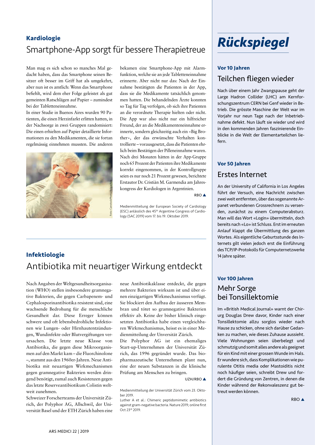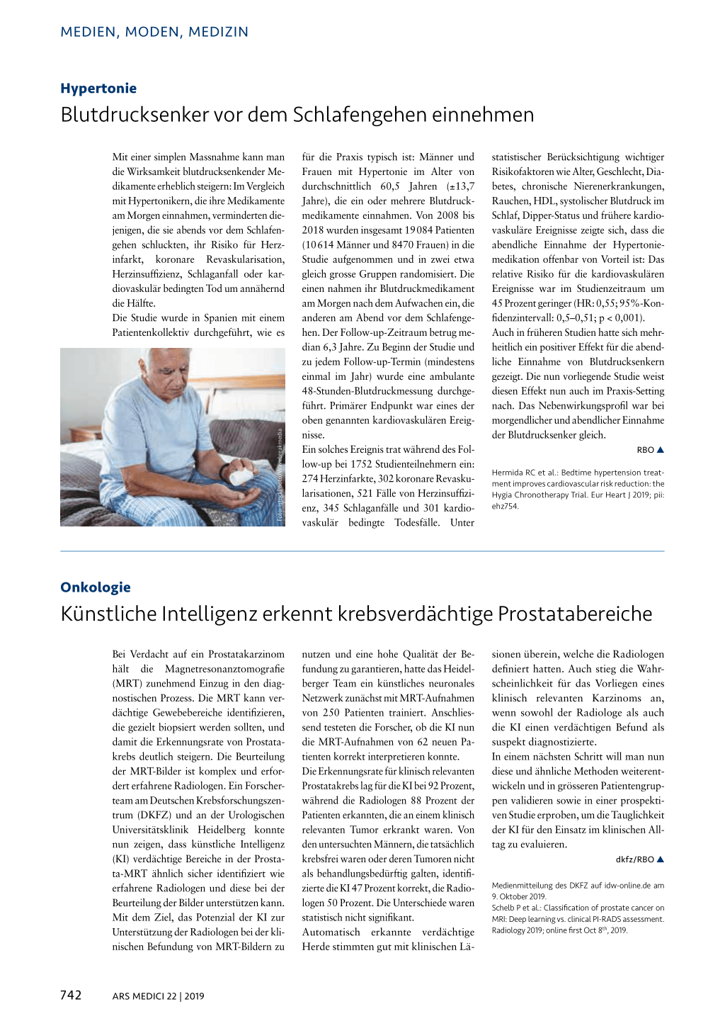 statistischer Berücksichtigung wichtiger Risikofaktoren wie Alter, Geschlecht, Diabetes, chronische Nierenerkrankungen, Rauchen, HDL, systolischer Blutdruck im Schlaf, Dipper-Status und frühere kardiovaskuläre Ereignisse zeigte sich, dass die abendliche Einnahme der Hypertoniemedikation offenbar von Vorteil ist: Das relative Risiko für die kardiovaskulären Ereignisse war im Studienzeitraum um 45 Prozent geringer (HR: 0,55; 95%-Konfidenzintervall: 0,5–0,51; p < 0,001). Auch in früheren Studien hatte sich mehrheitlich ein positiver Effekt für die abendliche Einnahme von Blutdrucksenkern gezeigt. Die nun vorliegende Studie weist diesen Effekt nun auch im Praxis-Setting nach. Das Nebenwirkungsprofil war bei morgendlicher und abendlicher Einnahme der Blutdrucksenker gleich. RBO s Hermida RC et al.: Bedtime hypertension treatment improves cardiovascular risk reduction: the Hygia Chronotherapy Trial. Eur Heart J 2019; pii: ehz754. Onkologie Künstliche Intelligenz erkennt krebsverdächtige Prostatabereiche Bei Verdacht auf ein Prostatakarzinom hält die Magnetresonanztomografie (MRT) zunehmend Einzug in den diagnostischen Prozess. Die MRT kann verdächtige Gewebebereiche identifizieren, die gezielt biopsiert werden sollten, und damit die Erkennungsrate von Prostatakrebs deutlich steigern. Die Beurteilung der MRT-Bilder ist komplex und erfordert erfahrene Radiologen. Ein Forscherteam am Deutschen Krebsforschungszentrum (DKFZ) und an der Urologischen Universitätsklinik Heidelberg konnte nun zeigen, dass künstliche Intelligenz (KI) verdächtige Bereiche in der Prostata-MRT ähnlich sicher identifiziert wie erfahrene Radiologen und diese bei der Beurteilung der Bilder unterstützen kann. Mit dem Ziel, das Potenzial der KI zur Unterstützung der Radiologen bei der klinischen Befundung von MRT-Bildern zu nutzen und eine hohe Qualität der Befundung zu garantieren, hatte das Heidelberger Team ein künstliches neuronales Netzwerk zunächst mit MRT-Aufnahmen von 250 Patienten trainiert. Anschliessend testeten die Forscher, ob die KI nun die MRT-Aufnahmen von 62 neuen Patienten korrekt interpretieren konnte. Die Erkennungsrate für klinisch relevanten Prostatakrebs lag für die KI bei 92 Prozent, während die Radiologen 88 Prozent der Patienten erkannten, die an einem klinisch relevanten Tumor erkrankt waren. Von den untersuchten Männern, die tatsächlich krebsfrei waren oder deren Tumoren nicht als behandlungsbedürftig galten, identifizierte die KI 47 Prozent korrekt, die Radiologen 50 Prozent. Die Unterschiede waren statistisch nicht signifikant. Automatisch erkannte verdächtige Herde stimmten gut mit klinischen Lä- sionen überein, welche die Radiologen definiert hatten. Auch stieg die Wahrscheinlichkeit für das Vorliegen eines klinisch relevanten Karzinoms an, wenn sowohl der Radiologe als auch die KI einen verdächtigen Befund als suspekt diagnostizierte. In einem nächsten Schritt will man nun diese und ähnliche Methoden weiterentwickeln und in grösseren Patientengruppen validieren sowie in einer prospektiven Studie erproben, um die Tauglichkeit der KI für den Einsatz im klinischen Alltag zu evaluieren. dkfz/RBO s Medienmitteilung des DKFZ auf idw-online.de am 9. Oktober 2019. Schelb P et al.: Classification of prostate cancer on MRI: Deep learning vs. clinical PI-RADS assessment. Radiology 2019; online first Oct 8th, 2019. 742 ARS MEDICI 22 | 2019 Kardiologie Smartphone-App sorgt für bessere Therapietreue Rückspiegel Man mag es sich schon so manches Mal gedacht haben, dass das Smartphone seinen Besitzer oft besser im Griff hat als umgekehrt, aber nun ist es amtlich: Wenn das Smartphone befiehlt, wird dem eher Folge geleistet als gut gemeinten Ratschlägen auf Papier – zumindest bei der Tabletteneinnahme. In einer Studie in Buenos Aires wurden 90 Patienten, die einen Herzinfarkt erlitten hatten, in der Nachsorge in zwei Gruppen randomisiert: Die einen erhielten auf Papier detaillierte Informationen zu den Medikamenten, die sie fortan regelmässig einnehmen mussten. Die anderen bekamen eine Smartphone-App mit Alarmfunktion, welche sie an jede Tabletteneinnahme erinnerte. Aber nicht nur das: Nach der Einnahme bestätigten die Patienten in der App, dass sie die Medikamente tatsächlich genommen hatten. Die behandelnden Ärzte konnten so Tag für Tag verfolgen, ob sich ihre Patienten an die verordnete Therapie hielten oder nicht. Die App war also nicht nur ein hilfreicher Freund, der an die Medikamenteneinnahme erinnerte, sondern gleichzeitig auch ein «Big Brother», der das erwünschte Verhalten kontrollierte – vorausgesetzt, dass die Patienten ehrlich beim Bestätigen der Pilleneinnahme waren. Nach drei Monaten hätten in der App-Gruppe noch 65 Prozent der Patienten ihre Medikamente korrekt eingenommen, in der Kontrollgruppe seien es nur noch 21 Prozent gewesen, berichtete Erstautor Dr. Cristiàn M. Garmendia am Jahreskongress der Kardiologen in Argentinien. RBO s Foto: CanstockPhoto/dolgachov Medienmitteilung der European Society of Cardiology (ESC) anlässlich des 45th Argentine Congress of Cardiology (SAC 2019) vom 17. bis 19. Oktober 2019. Infektiologie Antibiotika mit neuartiger Wirkung entdeckt Nach Angaben der Weltgesundheitsorganisation (WHO) stellen insbesondere gramnegative Bakterien, die gegen Carbapenem- und Cephalosporinantibiotika resistent sind, eine wachsende Bedrohung für die menschliche Gesundheit dar. Diese Erreger können schwere und oft lebensbedrohliche Infektionen wie Lungen- oder Hirnhautentzündungen, Wundinfekte oder Blutvergiftungen verursachen. Die letzte neue Klasse von Antibiotika, die gegen diese Mikroorganismen auf den Markt kam – die Fluorchinolone –, stammt aus den 1960er-Jahren. Neue Antibiotika mit neuartigen Wirkmechanismen gegen gramnegative Bakterien werden dringend benötigt, zumal auch Resistenzen gegen das letzte Reserveantibiotikum Colistin weltweit zunehmen. Schweizer Forscherteams der Universität Zürich, der Polyphor AG, Al