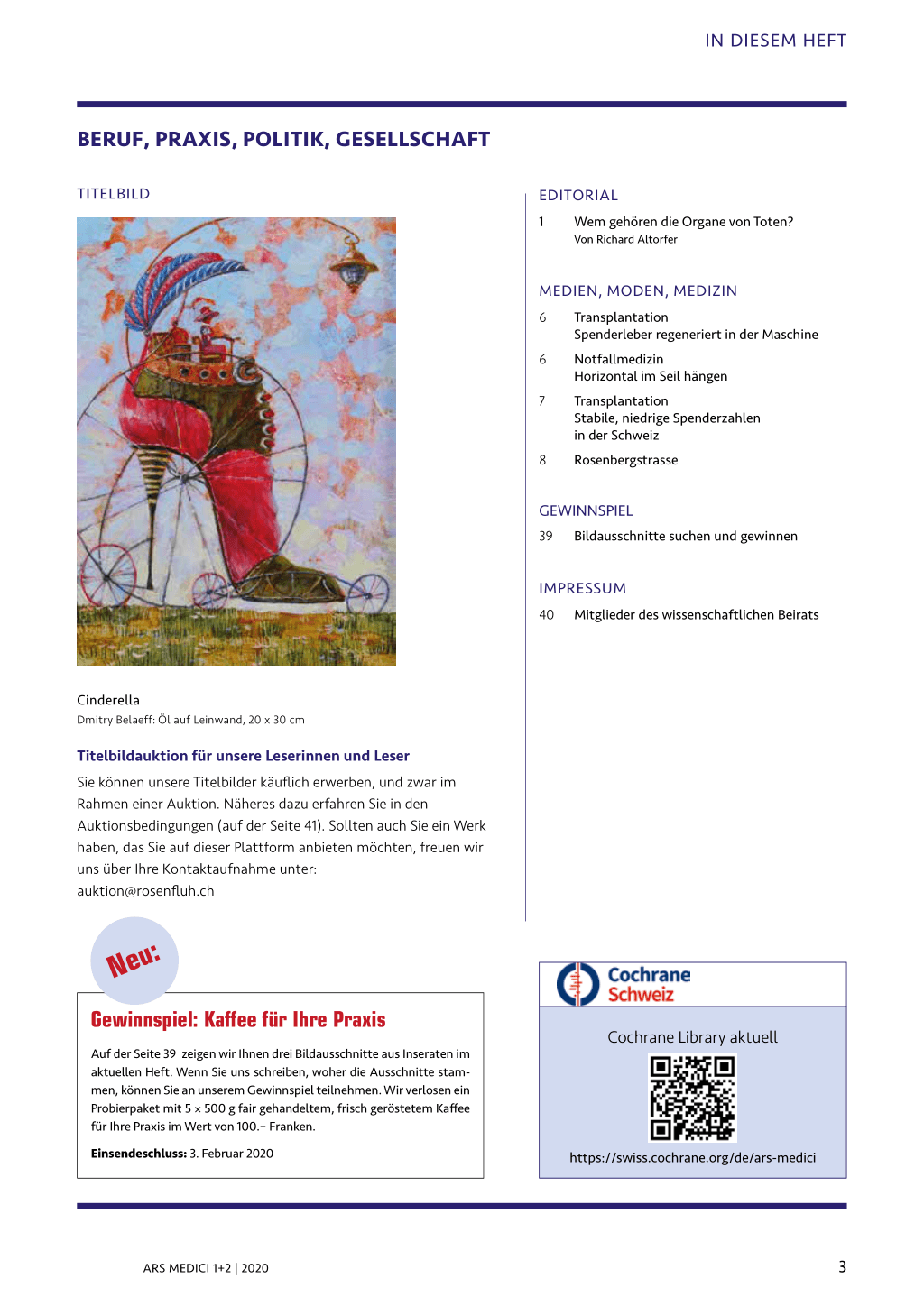 Titelbildauktion für unsere Leserinnen und Leser Sie können unsere Titelbilder käuflich erwerben, und zwar im Rahmen einer Auktion. Näheres dazu erfahren Sie in den Auktions­bedingungen (auf der Seite 41). Sollten auch Sie ein Werk haben, das Sie auf ­dieser Plattform anbieten möchten, freuen wir uns über Ihre Kontaktaufnahme unter: auktion@rosenfluh.ch