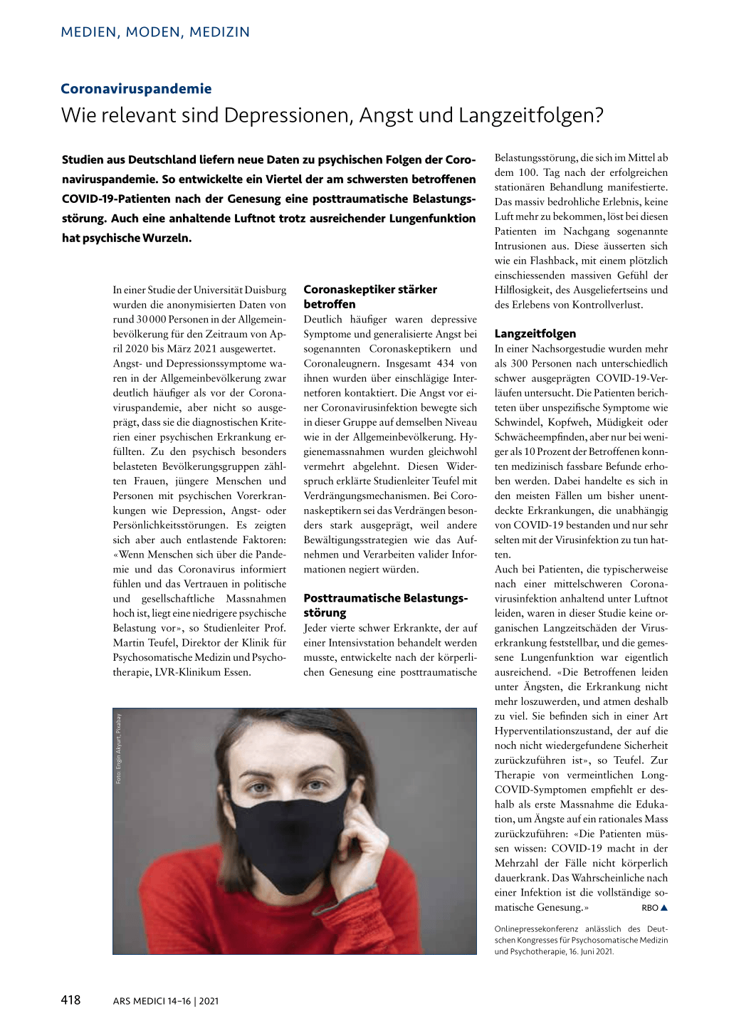 Studien aus Deutschland liefern neue Daten zu psychischen Folgen der Coronaviruspandemie. So entwickelte ein Viertel der am schwersten betroffenen COVID-19-Patienten nach der Genesung eine posttraumatische Belastungsstörung. Auch eine anhaltende Luftnot trotz ausreichender Lungenfunktion hat psychische Wurzeln.
