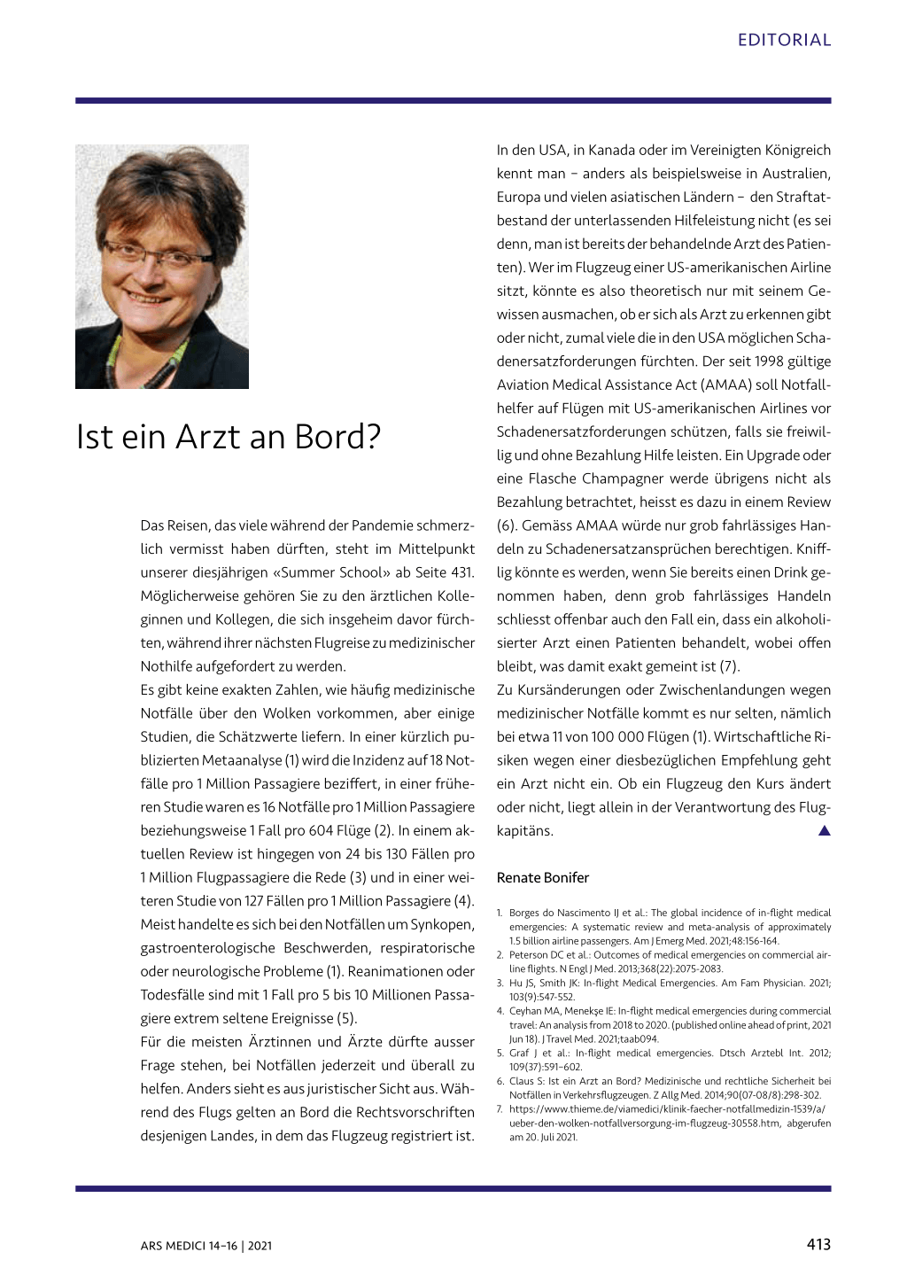 Das Reisen, das viele während der Pandemie schmerzlich vermisst haben dürften, steht im Mittelpunkt unserer diesjährigen «Summer School» ab Seite 431. Möglicherweise gehören Sie zu den ärztlichen Kolleginnen und Kollegen, die sich insgeheim davor fürchten, während ihrer nächsten Flugreise zu medizinischer Nothilfe aufgefordert zu werden. Es gibt keine exakten Zahlen, wie häufig medizinische Notfälle über den Wolken vorkommen, aber einige Studien, die Schätzwerte liefern. In einer kürzlich publizierten Metaanalyse (1) wird die Inzidenz auf 18 Notfälle pro 1 Million Passagiere beziffert, in einer früheren Studie waren es 16 Notfälle pro 1 Million Passagiere beziehungsweise 1 Fall pro 604 Flüge (2). In einem aktuellen Review ist hingegen von 24 bis 130 Fällen pro 1 Million Flugpassagiere die Rede (3) und in einer weiteren Studie von 127 Fällen pro 1 Million Passagiere (4). Meist handelte es sich bei den Notfällen um Synkopen, gastroenterologische Beschwerden, respiratorische oder neurologische Probleme (1). Reanimationen oder Todesfälle sind mit 1 Fall pro 5 bis 10 Millionen Passagiere extrem seltene Ereignisse (5). Für die meisten Ärztinnen und Ärzte dürfte ausser Frage stehen, bei Notfällen jederzeit und überall zu helfen. Anders sieht es aus juristischer Sicht aus. Während des Flugs gelten an Bord die Rechtsvorschriften desjenigen Landes, in dem das Flugzeug registriert ist.