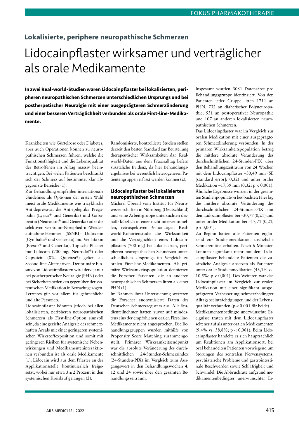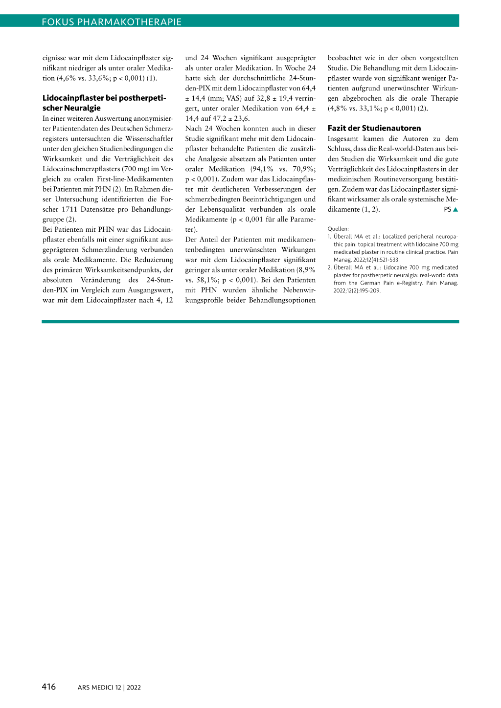 Insgesamt wurden 3081 Datensätze pro Behandlungsgruppe identifiziert. Von den Patienten jeder Gruppe litten 1711 an PHN, 732 an diabetischer Polyneuropathie, 531 an postoperativer Neuropathie und 107 an anderen lokalisierten neuropathischen Schmerzen. Das Lidocainpflaster war im Vergleich zur oralen Medikation mit einer ausgeprägteren Schmerzlinderung verbunden. In der primären Wirksamkeitspopulation betrug die mittlere absolute Veränderung des durchschnittlichen 24-Stunden-PIX über den Behandlungszeitraum von 24 Wochen mit dem Lidocainpflaster –30,49 mm (SE [standard error]: 0,32) und unter oraler Medikation –17,39 mm (0,32; p < 0,001). Ähnliche Ergebnisse wurden in der gesamten Studienpopulation beobachtet: Hier lag die mittlere absolute Veränderung des durchschnittlichen 24-Stunden-PIX mit dem Lidocainpflaster bei –30,77 (0,21) und unter oraler Medikation bei –17,71 (0,21; p < 0,001). Zu Beginn hatten alle Patienten ergänzend zur Studienmedikation zusätzliche Schmerzmittel erhalten. Nach 6 Monaten konnten signifikant mehr mit dem Lidocainpflaster behandelte Patienten die zusätzliche Analgesie absetzen als Patienten unter oraler Studienmedikation (43,1% vs. 10,5%; p < 0,001). Des Weiteren war das Lidocainpflaster im Vergleich zur oralen Medikation mit einer signifikant ausgeprägteren Verbesserung schmerzbedingter Alltagsbeeinträchtigungen und der Lebensqualität verbunden (p < 0,001 für beide). Medikamentenbedingte unerwünschte Ereignisse traten mit dem Lidocainpflaster seltener auf als unter oralen Medikamenten (9,4% vs. 58,8%; p < 0,001). Beim Lidocainpflaster handelte es sich hauptsächlich um Reaktionen am Applikationsort, bei oral behandelten Patienten vorwiegend um Störungen des zentralen Nervensystems, psychiatrische Probleme und gastrointestinale Beschwerden sowie Schläfrigkeit und Schwindel. Die Abbruchrate aufgrund medikamentenbedingter unerwünschter Er- ARS MEDICI 12 | 2022 415 FOKUS PHARMAKOTHERAPIE eignisse war mit dem Lidocainpflaster signifikant niedriger als unter oraler Medikation (4,6% vs. 33,6%; p < 0,001) (1). Lidocainpflaster bei postherpetischer Neuralgie In einer weiteren Auswertung anonymisierter Patientendaten des Deutschen Schmerzregisters untersuchten die Wissenschaftler unter den gleichen Studienbedingungen die Wirksamkeit und die Verträglichkeit des Lidocainschmerzpflasters (700 mg) im Vergleich zu oralen First-line-Medikamenten bei Patienten mit PHN (2). Im Rahmen dieser Untersuchung identifizierten die Forscher 1711 Datensätze pro Behandlungsgruppe (2). Bei Patienten mit PHN war das Lidocainpflaster ebenfalls mit einer signifikant ausgeprägteren Schmerzlinderung verbunden als orale Medikamente. Die Reduzierung des primären Wirksamkeitsendpunkts, der absoluten Veränderung des 24-Stunden-PIX im Vergleich zum Ausgangswert, war mit dem Lidocainpflaster nach 4, 12 und 24 Wochen signifikant ausgeprägter als unter oraler Medikation. In Woche 24 hatte sich der durchschnittliche 24-Stunden-PIX mit dem Lidocainpflaster von 64,4 ± 14,4 (mm; VAS) auf 32,8 ± 19,4 verringert, unter oraler Medikation von 64,4 ± 14,4 auf 47,2 ± 23,6. Nach 24 Wochen konnten auch in dieser Studie signifikant mehr mit dem Lidocainpflaster behandelte Patienten die zusätzliche Analgesie absetzen als Patienten unter oraler Medikation (94,1% vs. 70,9%; p < 0,001). Zudem war das Lidocainpflaster mit deutlicheren Verbesserungen der schmerzbedingten Beeinträchtigungen und der Lebensqualität verbunden als orale Medikamente (p < 0,001 für alle Parameter). Der Anteil der Patienten mit medikamentenbedingten unerwünschten Wirkungen war mit dem Lidocainpflaster signifikant geringer als unter oraler Medikation (8,9% vs. 58,1%; p < 0,001). Bei den Patienten mit PHN wurden ähnliche Nebenwirkungsprofile beider Behandlungsoptionen beobachtet wie in der oben vorgestellten Studie. Die Behandlung mit dem Lidocainpflaster wurde von signifikant weniger Patienten aufgrund unerwünschter Wirkungen abgebrochen als die orale Therapie (4,8% vs. 33,1%; p < 0,001) (2). Fazit der Studienautoren Insgesamt kamen die Autoren zu dem Schluss, dass die Real-world-Daten aus bei- den Studien die Wirksamkeit und die gute Verträglichkeit des Lidocainpflasters in der medizinischen Routineversorgung bestäti- gen. Zudem war das Lidocainpflaster signi- fikant wirksamer als orale systemische Me- dikamente (1, 2). PS s Quellen: 1. Überall MA et al.: Localized peripheral neuropa- thic pain: topical treatment with lidocaine 700 mg medicated plaster in routine clinical practice. Pain Manag. 2022;12(4):521-533. 2. Überall MA et al.: Lidocaine 700 mg medicated plaster for postherpetic neuralgia: real-world data from the German Pain e-Registry. Pain Manag. 2022;12(2):195-209. 416 ARS MEDICI 12 | 2022