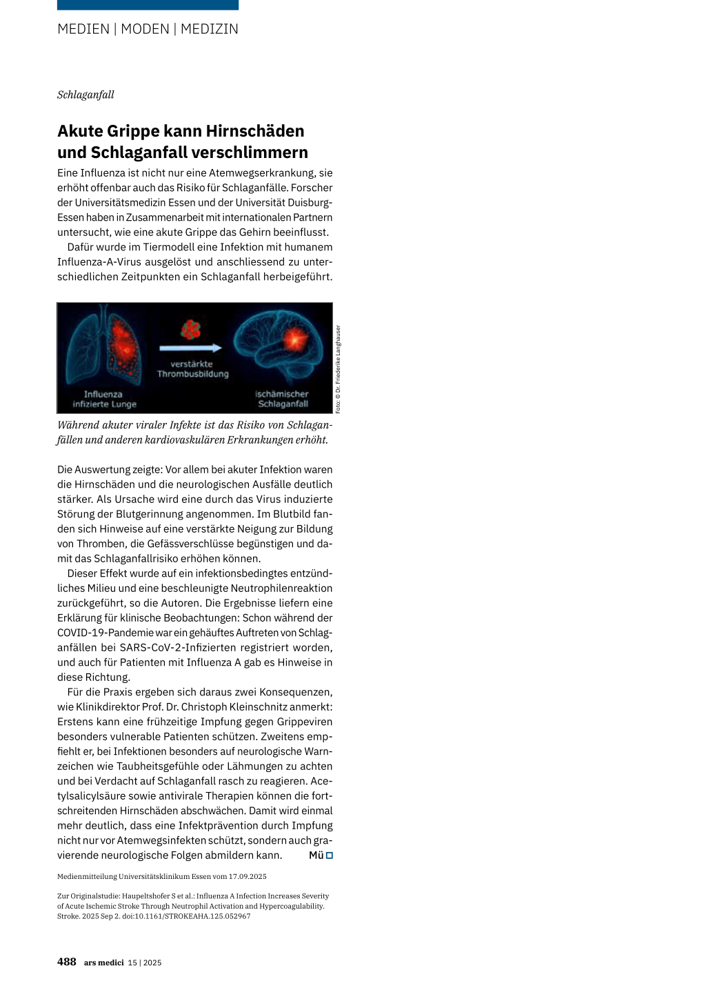 Zur Originalstudie: Haupeltshofer S et al.: Influenza A Infection Increases Severity of Acute Ischemic Stroke Through Neutrophil Activation and Hypercoagulability. Stroke. 2025 Sep 2. doi:10.1161/STROKEAHA.125.052967